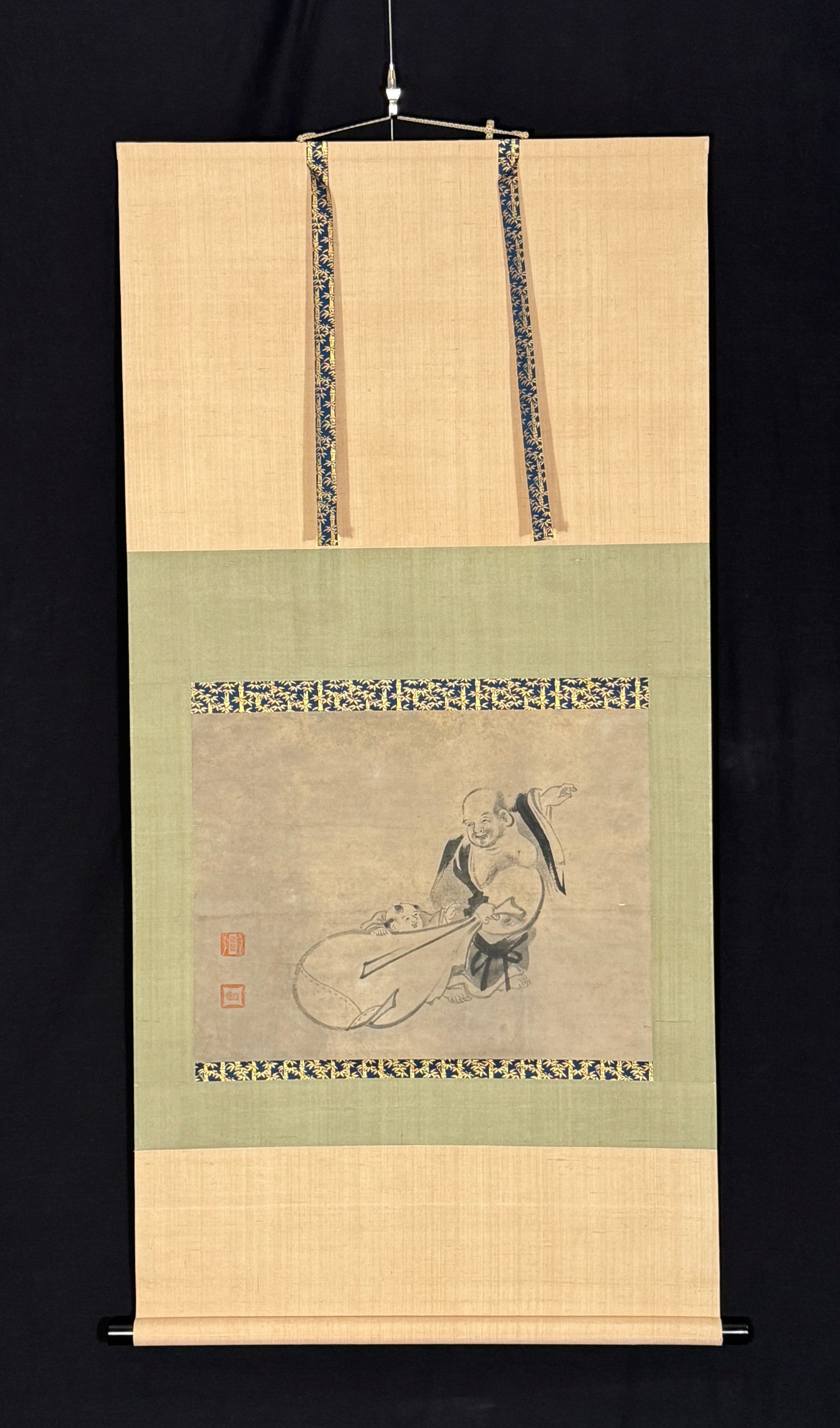 Hotei is one of the Seven Gods of Fortune, who are nowadays present in Japan, especially on New Year's Day. Hotei can be recognized by the large sack (full of wealth and luck) that he carries with him; his belly rivals this. His smile is charming and loving - it is usually directed at one or more children. Even in old age, Hotei can play jokes that children like, and he is perfectly happy in their company. Hotei is probably the most frequently painted god of fortune.