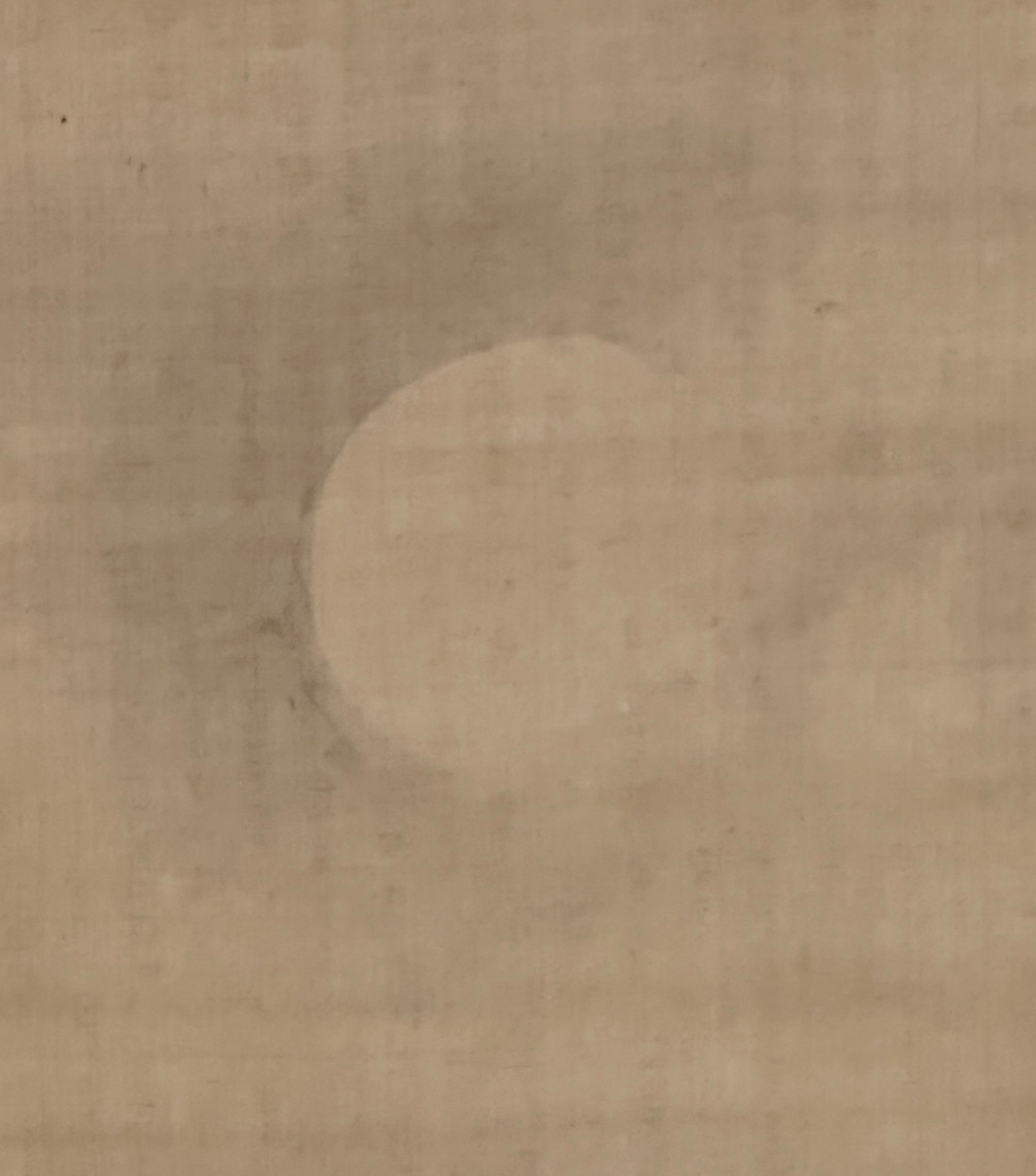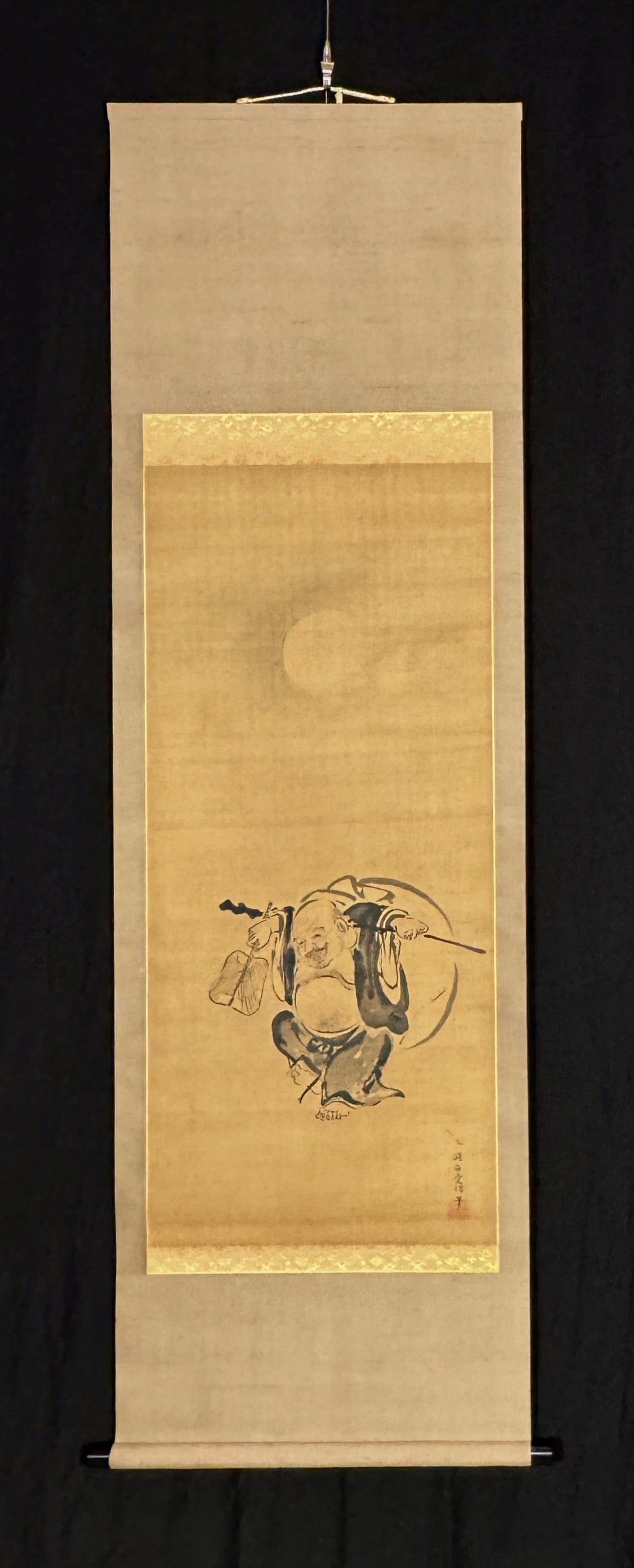 The dancing god of fortune Hotei (one of the Seven Gods of Fortune, of Chinese origin, who are particularly popular at New Year) is a frequently painted motif that follows a model down to the smallest details: the way the god lays his walking stick across his back and lets his right hand, which holds the clearly Chinese-shaped fan, hang down, is just as standard as the bent right dancing leg and the voluminous sack on his back. What is not present in other pictures of this dancing Hotei (so this is an addition by Dōhaku) is the full moon. But here it has a deep formal relationship to the depiction of this god of fortune: the sack, the belly, the bald head are just as round as the moon - and the whole figure is inscribed in a circle. The concept of this depiction, which was once created by a great Kanō master, is excellent, and so it makes perfect sense that the picture was painted again and again in many studios of Kanō painters.