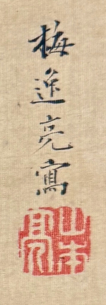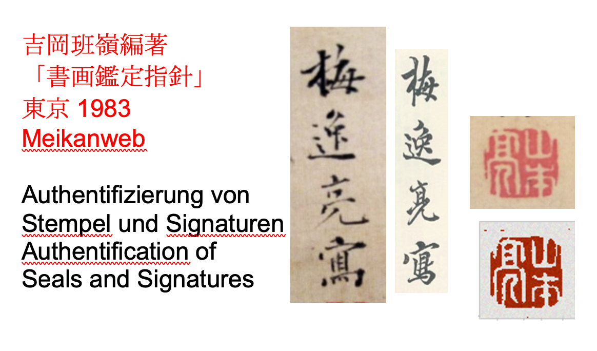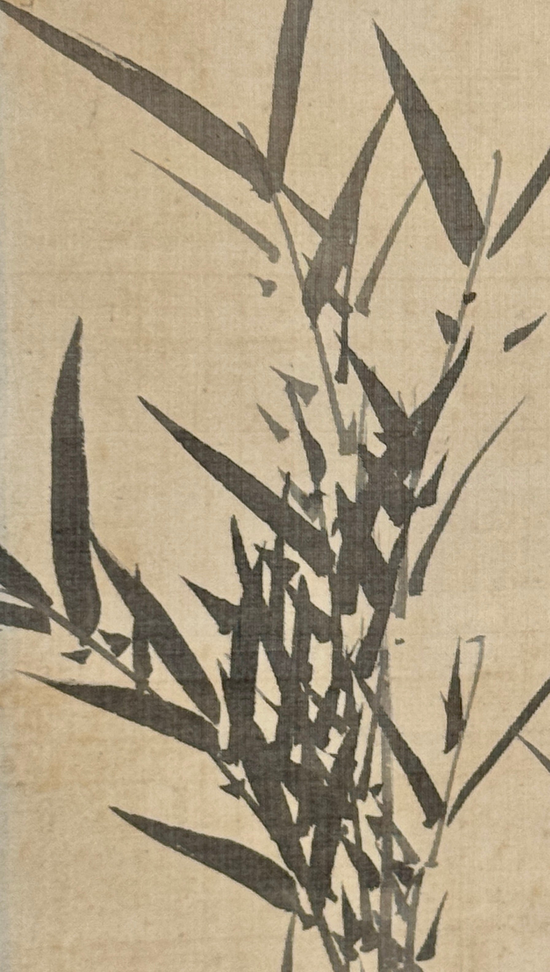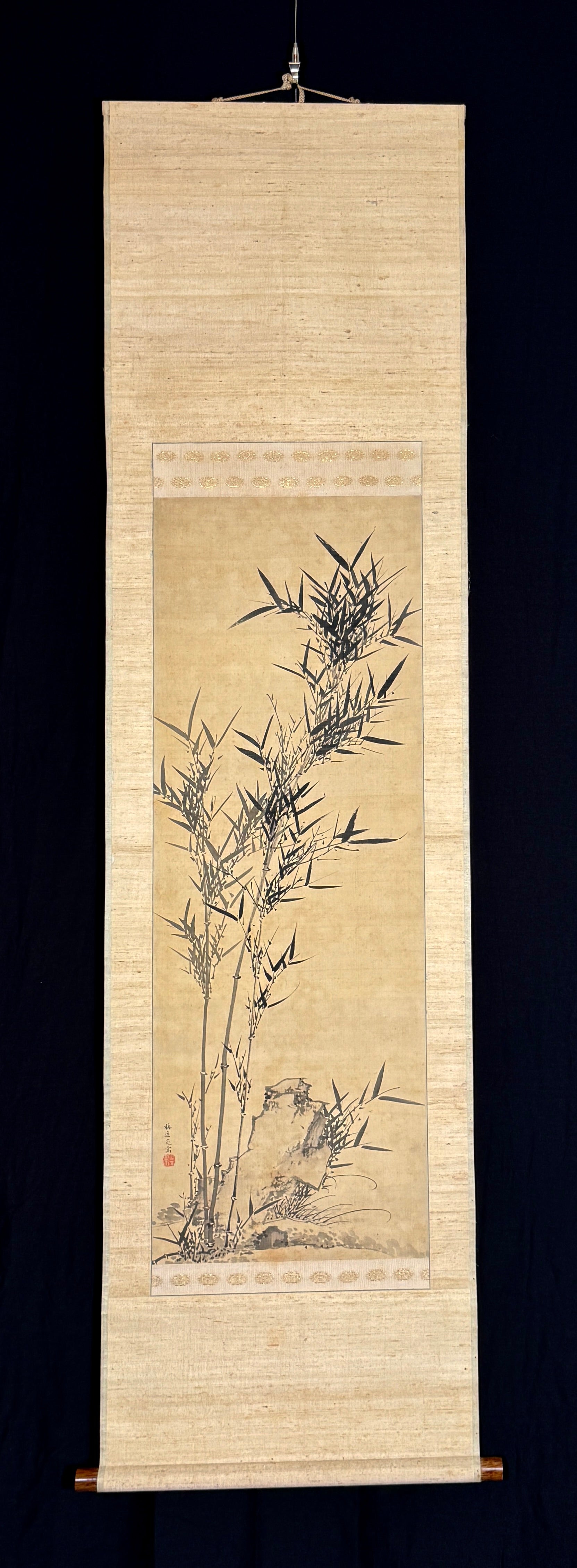 Diese Bambus-Studie könnte insofern von chinesischer Hand sein, als der Umgang mit der Leerfläche nicht japanisch anmutet. Und der kleine Felsbrocken an der Basis erinnert an die Zierfelsen, wie man sie in chinesischen Gärten findet. Doch diese Kommentare sollen in keiner Weise das Bild als solches in ein Epigonen-Licht rücken. Baiitsu war eine ganz starke Malerpersönlichkeit, die bis ins Detail sich treu blieb. Die Vielfalt der Schwarz- und Graustufen im Bambusblätterwerk ist reich, und der Rhythmus von Verdichtung und Lockerheit atmet Natürlichkeit. Keine Stelle wirkt bloß routiniert gemalt, überall ist künstlerische Entscheidung und Sorgfalt spürbar.Die Montierung des Bildes ist original. Das Gelb der Seide erinnert wiederum stark an chinesische Montierungen des 18. Jahrhunderts. Unterschrift und Siegel sind überzeugend.