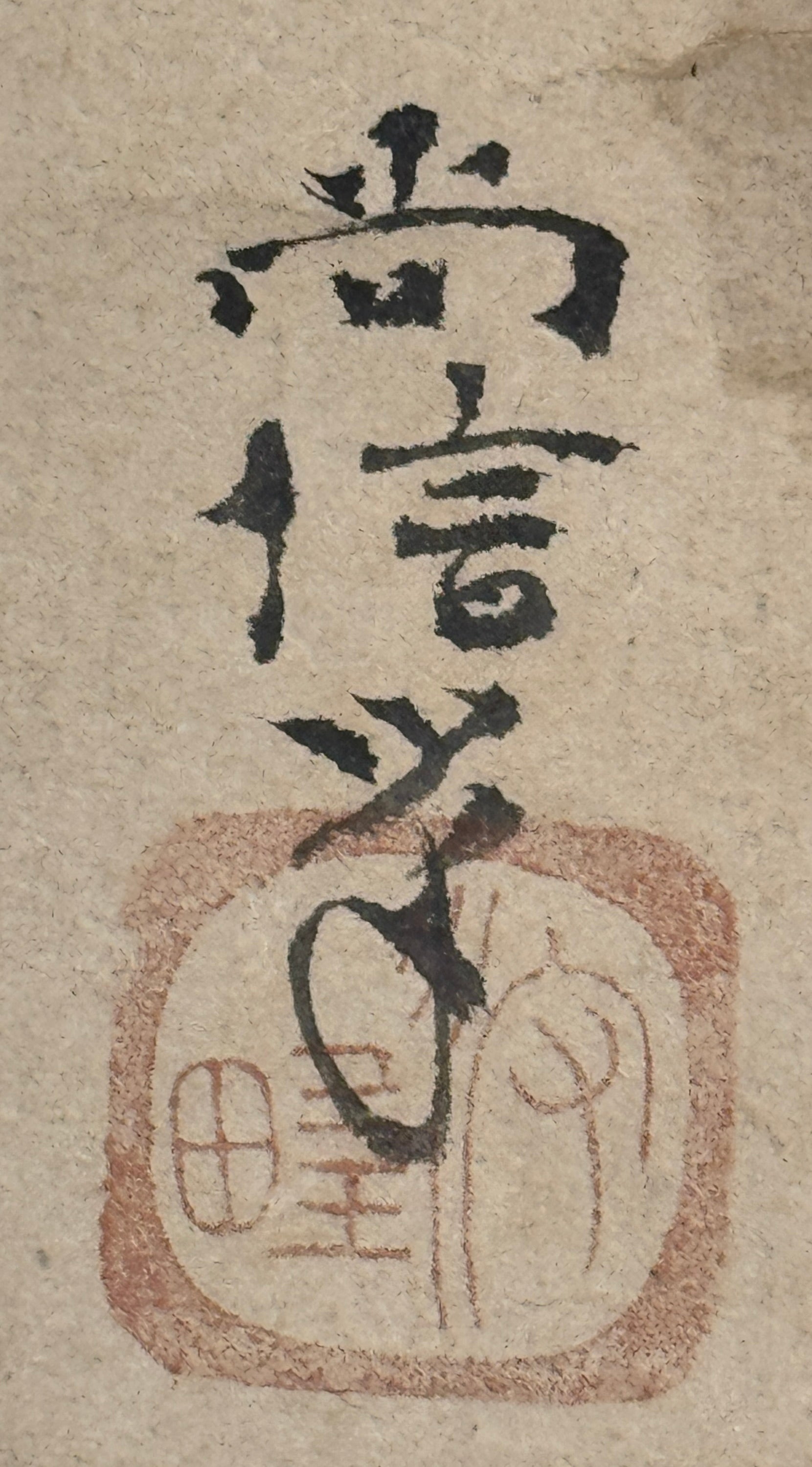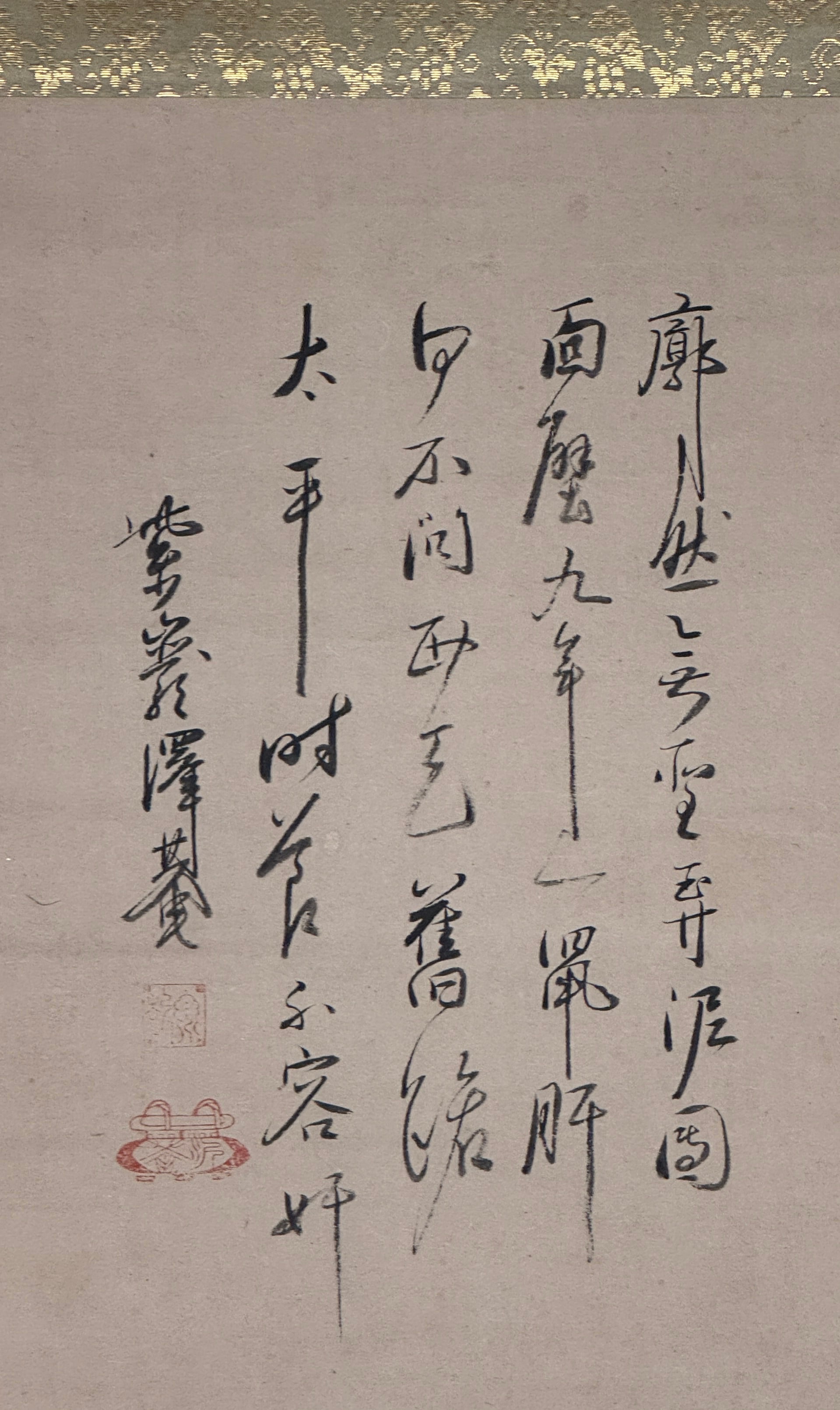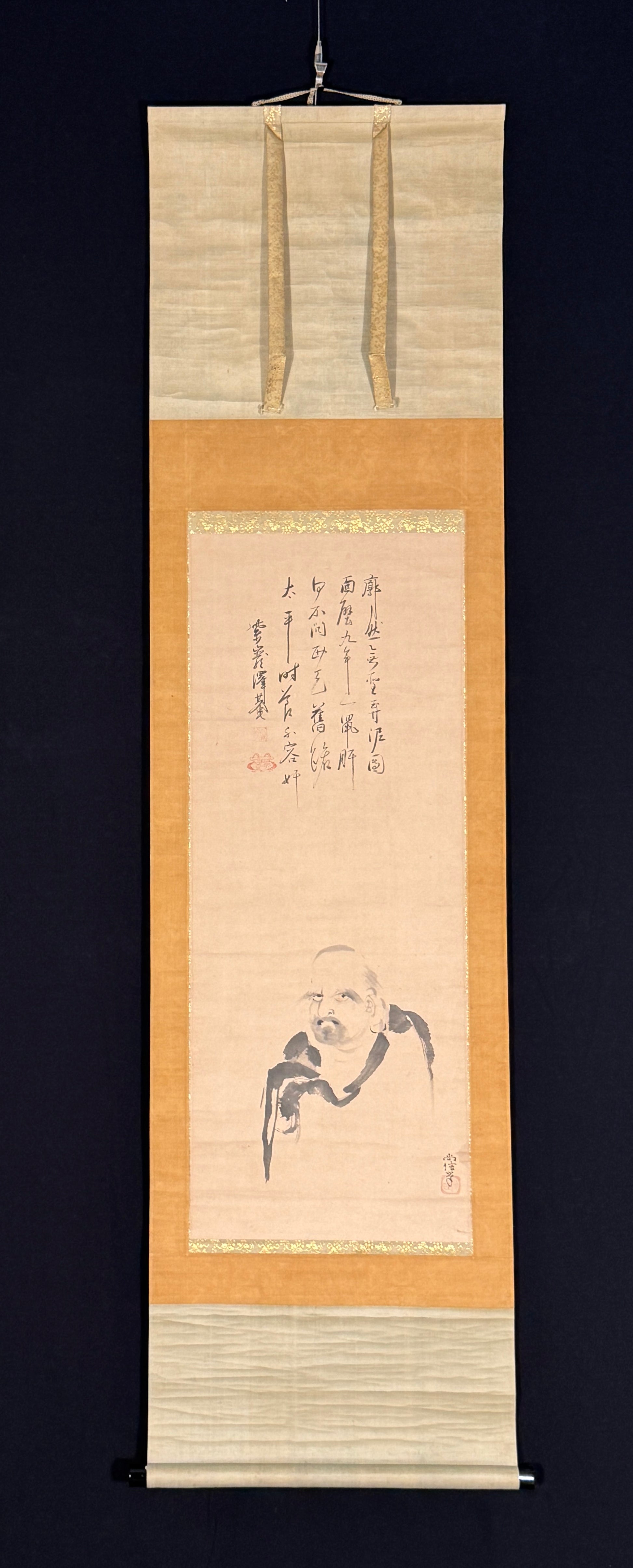 Takuan Sōhō ist ein Mönch der Rinzai-Sekte, der größten Einfluss auf die Zen-Schulung von Samurais hatte. Er war Berater der wichtigsten Politiker und Fürsten und hinterließ ein eindrückliches schriftstellerisches Werk. Seine Kalligrafie besticht durch Gefasstheit und innere Sicherheit der Zeichenverteilung. Ernsthaftigkeit und Eleganz verschmelzen hier auf wunderbare Weise. Der ganze etwas chinesisch anmutende Block der Kalligrafie ist in perfekter Balance zum Daruma-Bildnis gesetzt.