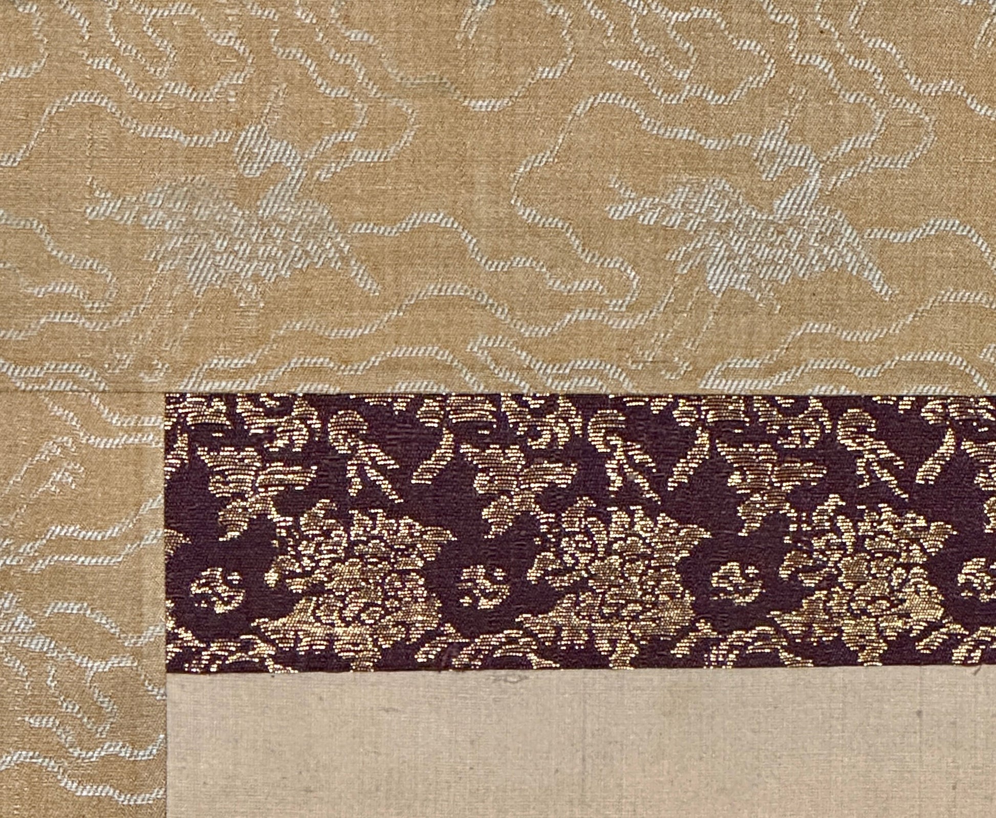 Fukurokuju mit der hohen Stirne ist ein häufig aufgegriffenes Sujet; japanische Maler liebten es, mit ihm das Gesicht eines gutmütigen, herzlichen alten Menschen darzustellen. In der Hand trägt er das „Duftjuwel“ (hōju), das die Verwirklichung der tiefsten Wünsche (im buddhistischen Sinne) symbolisiert. Der Fukurokuju in dieser Darstellung schwebt auf einer Wolke daher, was sehr speziell ist. In der Regel wird in Japan kein Gott als auf Wolken schwebendes Wesen dargestellt. Eigentlich nur beim raigō-Motiv (wenn Buddha mit seinem Hoforchester vom Himmel herunterkommt) gleiten die engelsgleichen Wesen musizierend auf Wolken zu einem Sterbenden hinunter, um ihn abzuholen und in himmlische Gefilde zu leiten. Dieses ungewöhnliche Setting hier von Fukurokuju hilft dem Betrachter, sich ganz auf seinen friedlichen und liebenswürdigen Gesichtsausdruck zu konzentrieren.