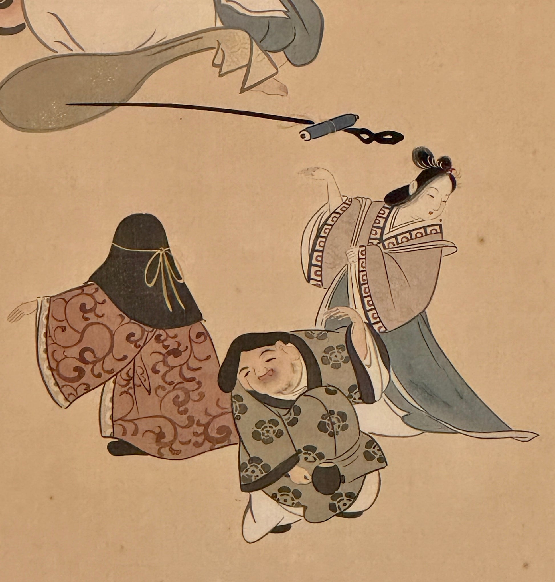 In der Dreiergruppe in der Mitte tanzt rechts Benzaiten, nach vorne gewendet Daikokuten und mit dem Rücken zum Betrachter gedreht vermutlich Fukurokuju.