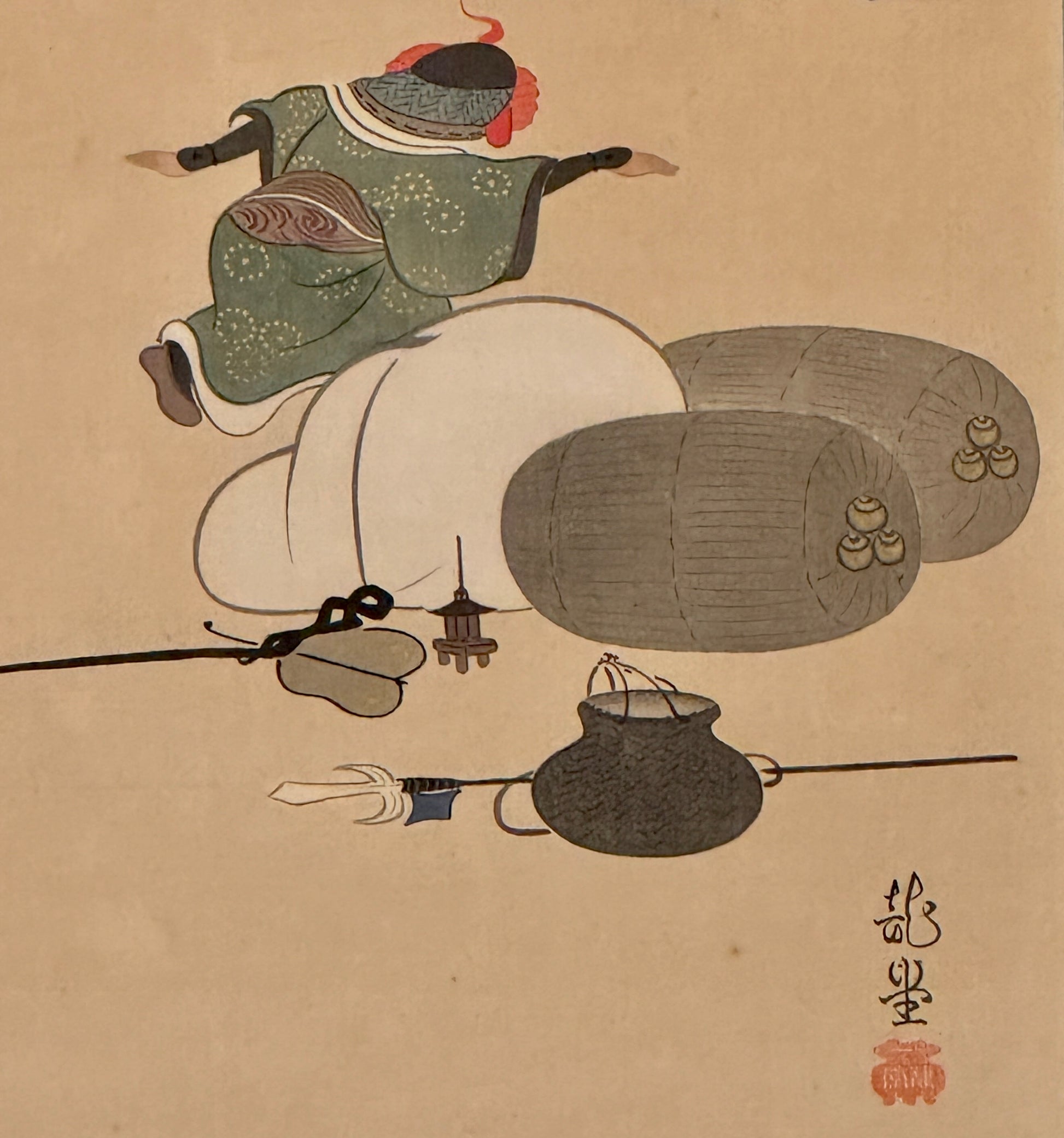 Die Behandlung des Themas - die Sieben Tanzenden Glücksgötter – ist originell und souverän abgehandelt. Das farbliche Konzept ist bestechend. Oben rechts tanzt Hotei, am chinesischen Fächer-Attribut erkennbar, Er hat seinen Sack abgelegt neben den Weißen Hirsch des Jurōjin und neben dem Duftjuwel des Fukurokuju. Davor liegt die eingepackte biwa-Laute der Benzaiten. Zuunterst dann findet sich der Stab mit der Schriftrolle von Jurōjin. Hinter diesen Utensilien tanzt Ebisu mit seiner Angelrute.