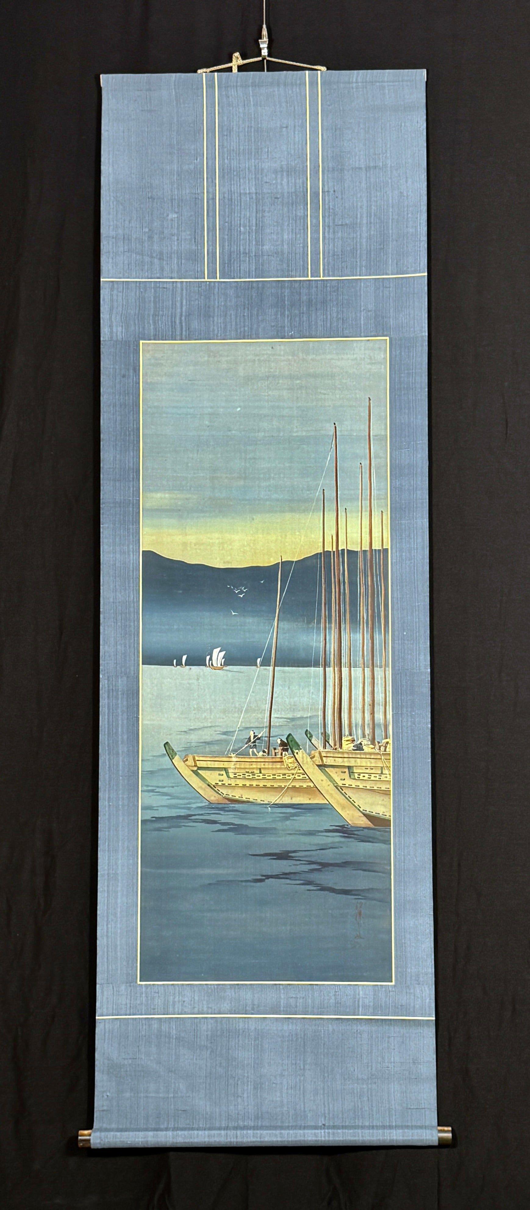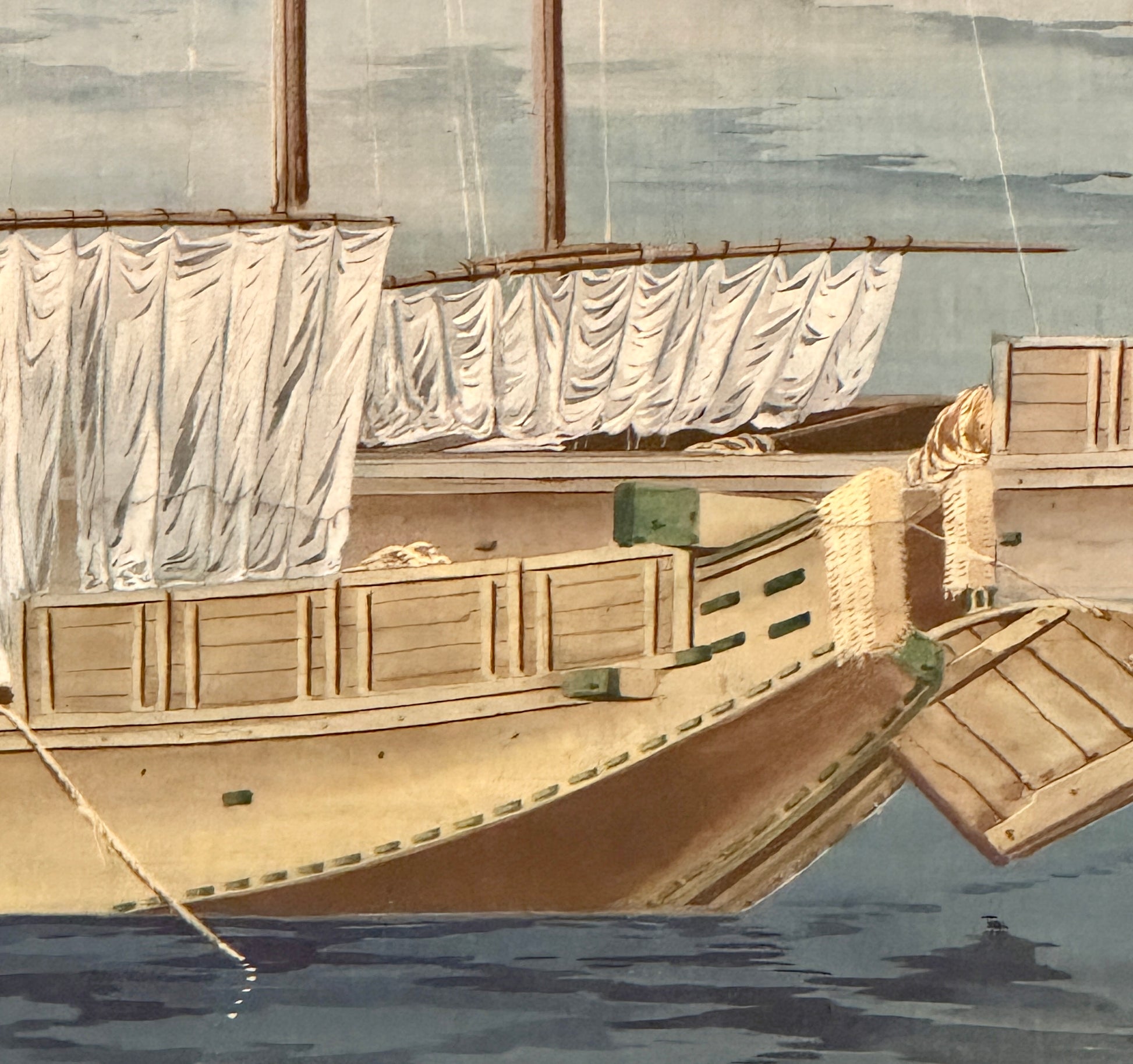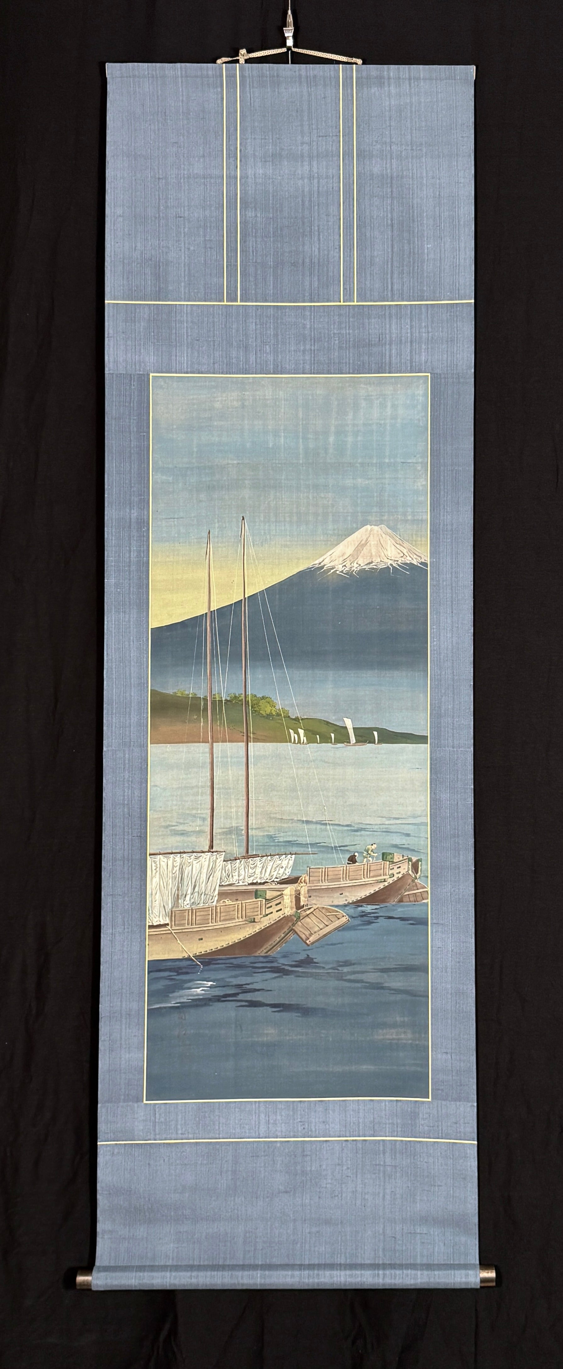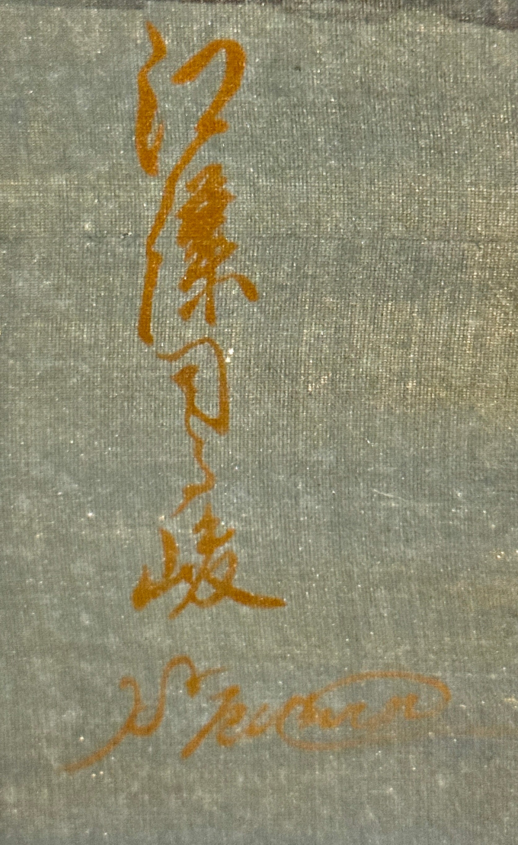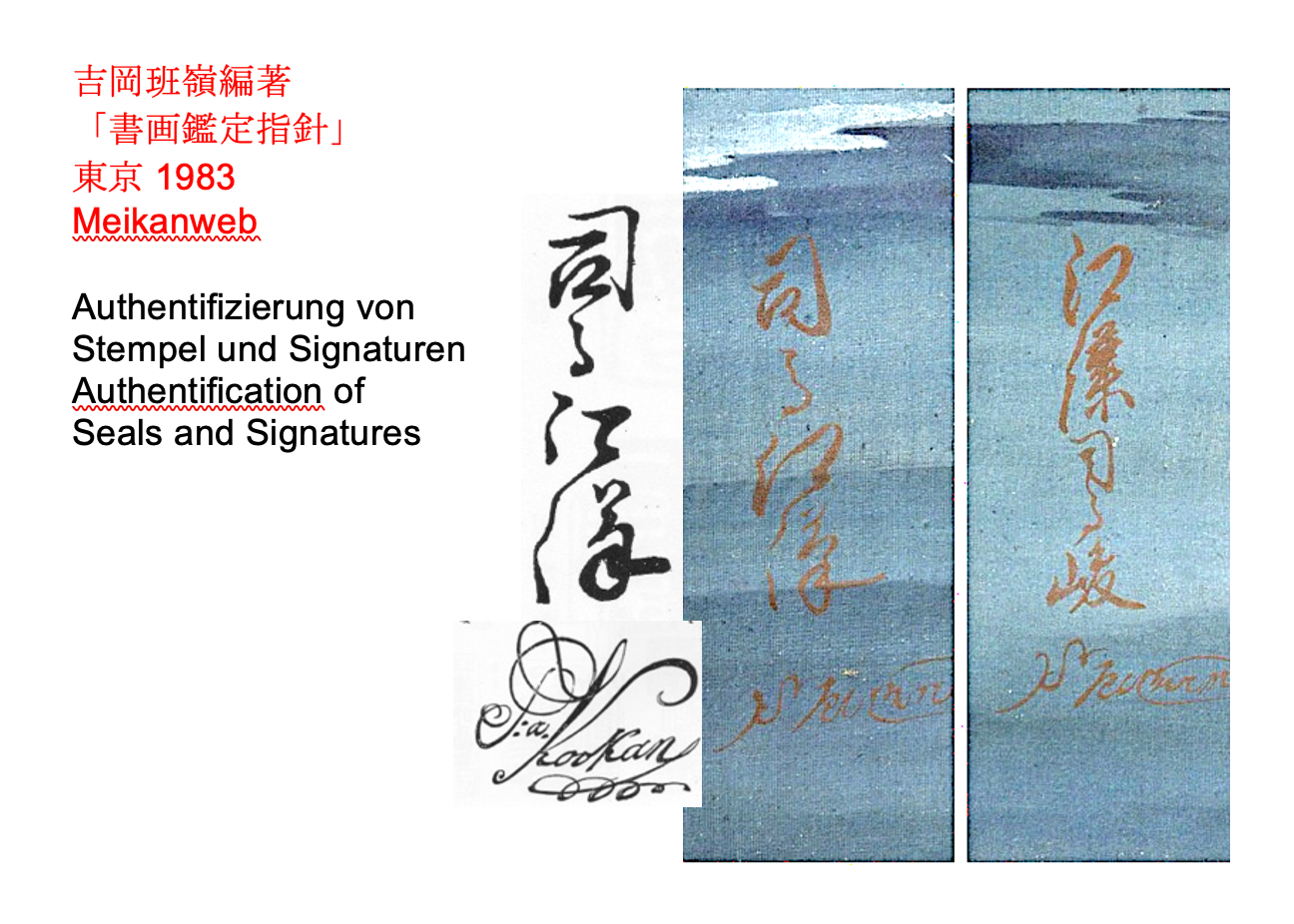 Dann gibt es aber sein anderes Gesicht: Eine Begegnung mit europäischer Malerei auf der quasi „Ghetto-Insel“ Deshima in Nagasaki erschütterte ihn dermaßen, dass er sich mit einer Intensität in die Studien europäischer Ölmalerei und Radierungskunst vertiefte, wie keiner seiner Zeitgenossen. Der vierzehn Jahre ältere Maruyama Ōkyō gilt als der Pionier der Assimilation westlicher Kunst im 18. Jahrhundert und hat virtuos Realismus, Perspektive und einheitliche Lichtführung in die japanische Kunst-Grammatik eingeführt. Kōkan war weniger diszipliniert (auch in manchen Bildern weniger geschickt) als das Genie Maruyama, dafür aber haben seine Bilder ein Leuchten, das ans Surrealistische grenzen kann. Das fast mediterran wirkende Blau dieser Bucht vor dem Götterberg Fuji hat man in der Kunstgeschichte noch nie so intensiv erlebt wie auf diesem Diptychon. Man ist an Bilder des Golfs von Capri mit dem Vesuv im Hintergrund erinnert. Doch die kleinen Matrosen auf den Schiffen bringen uns rasch zurück nach Japan.Eine Spezialität von Kōkan ist auch seine westliche Unterschrift – sie ist dekorativ und jedes Mal unverbindlich ein bisschen anders – auch in dieser Hinsicht ist er vollkommen ein Außenseiter.