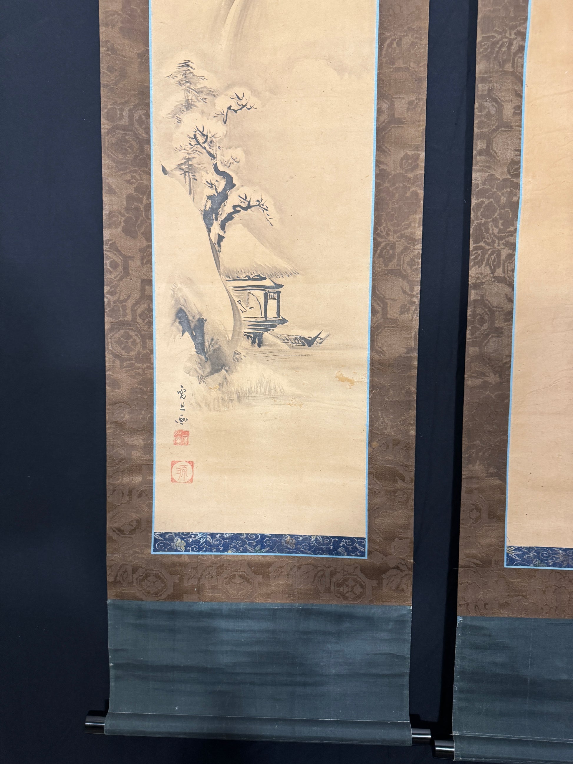 Unterschrift und Siegel konnten nicht verifiziert werden, da Holzschnittkünstler in Malerei-Referenzwerken oft nicht zu finden sind, und umgekehrt die Signaturen auf Malereien von Holzschnittkünstlern nicht in den Referenzwerken von Holzschnittkünstlern erfasst sind… In der oben erwähnten Veduten-Sammlung von Edo (in Edo Meishō Zue) findet sich seine Unterschrift oft, aber dabei ist das erste Zeichen (anders als auf diesem Bild) immer deutlich als „Schnee“ geschrieben, und so soll dieses Diptychon als „zugeeignet“ gelten. - Die Montierung weist Altersspuren auf, ist aber im Ensemble sehr stimmig.