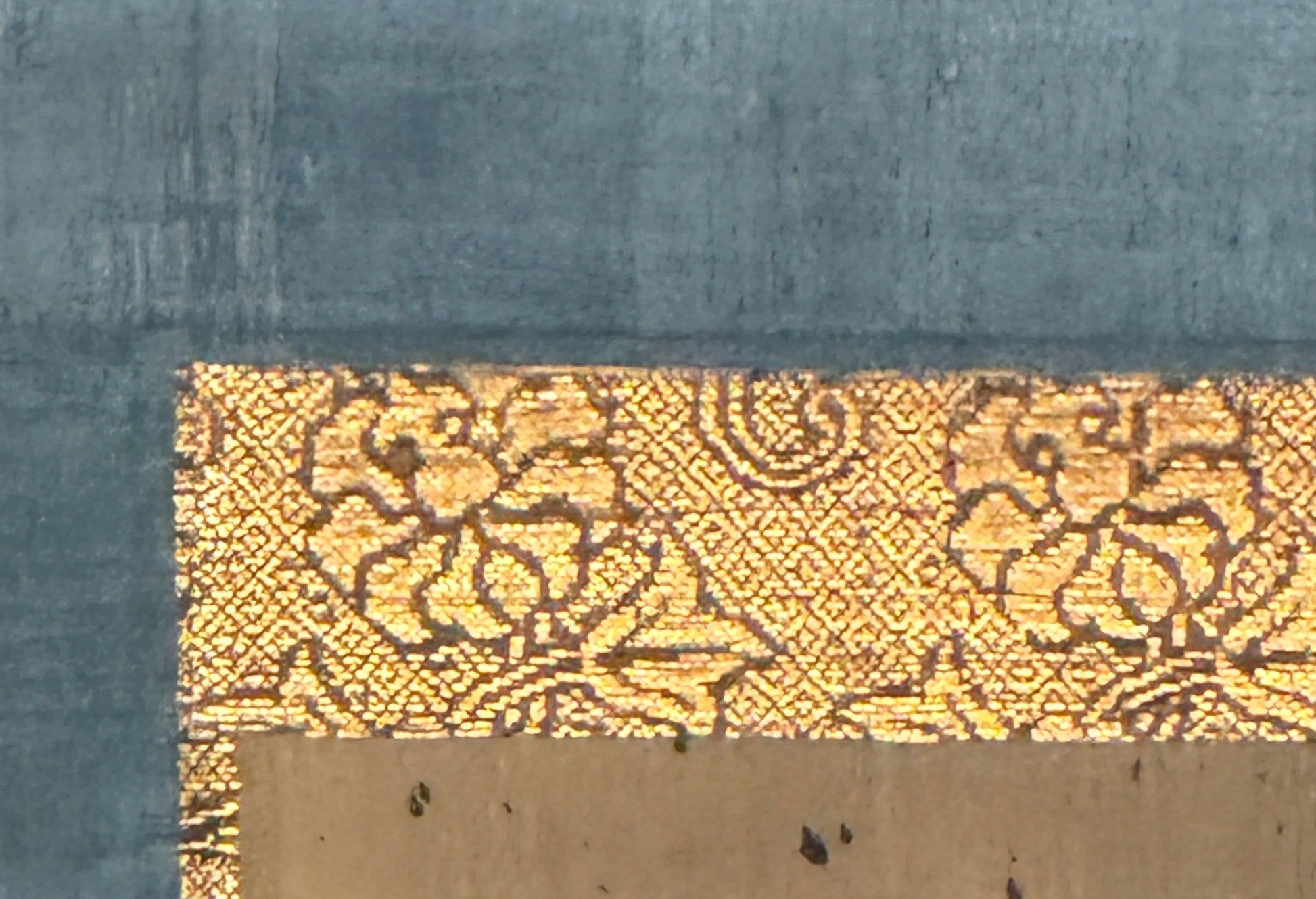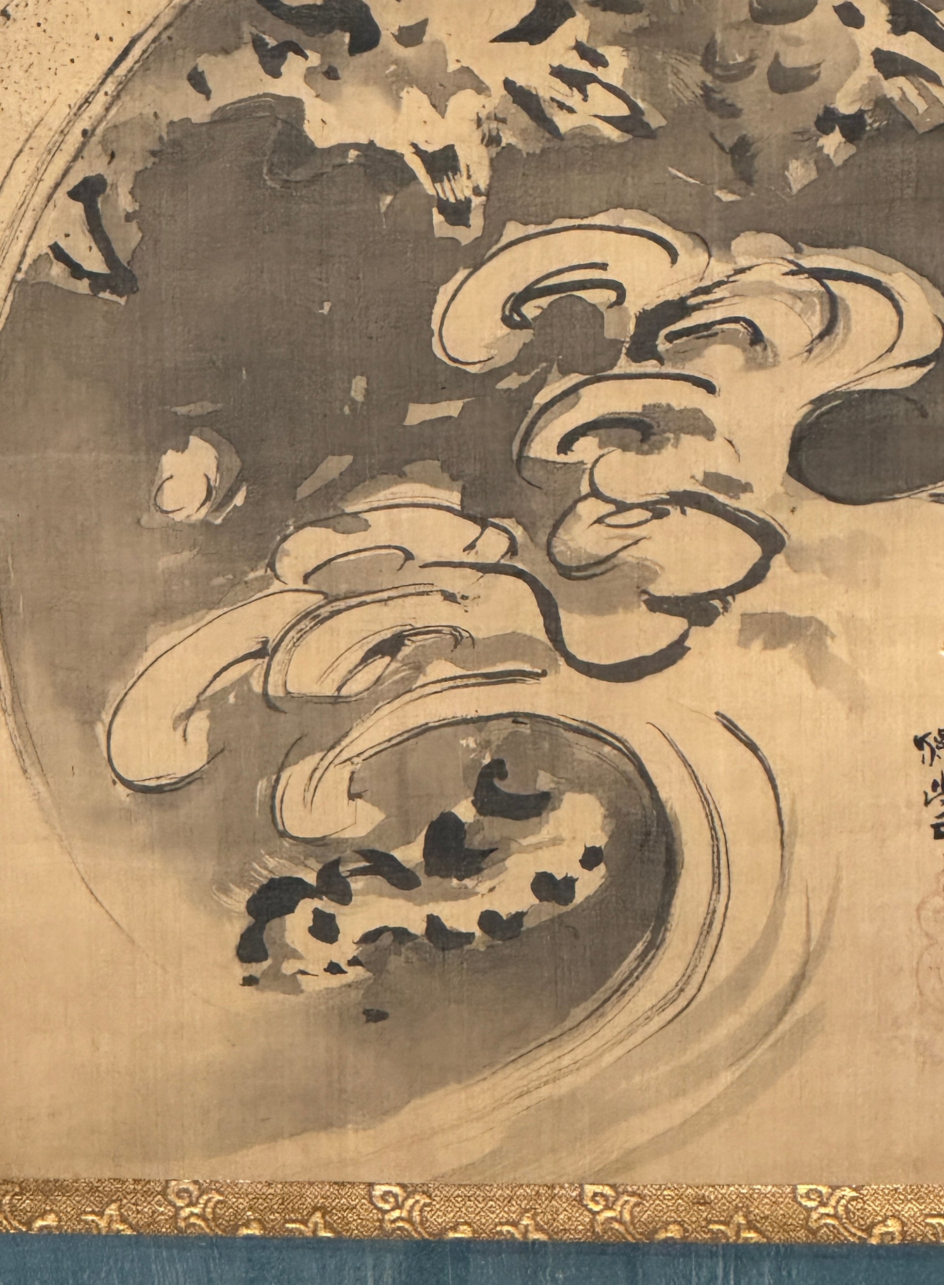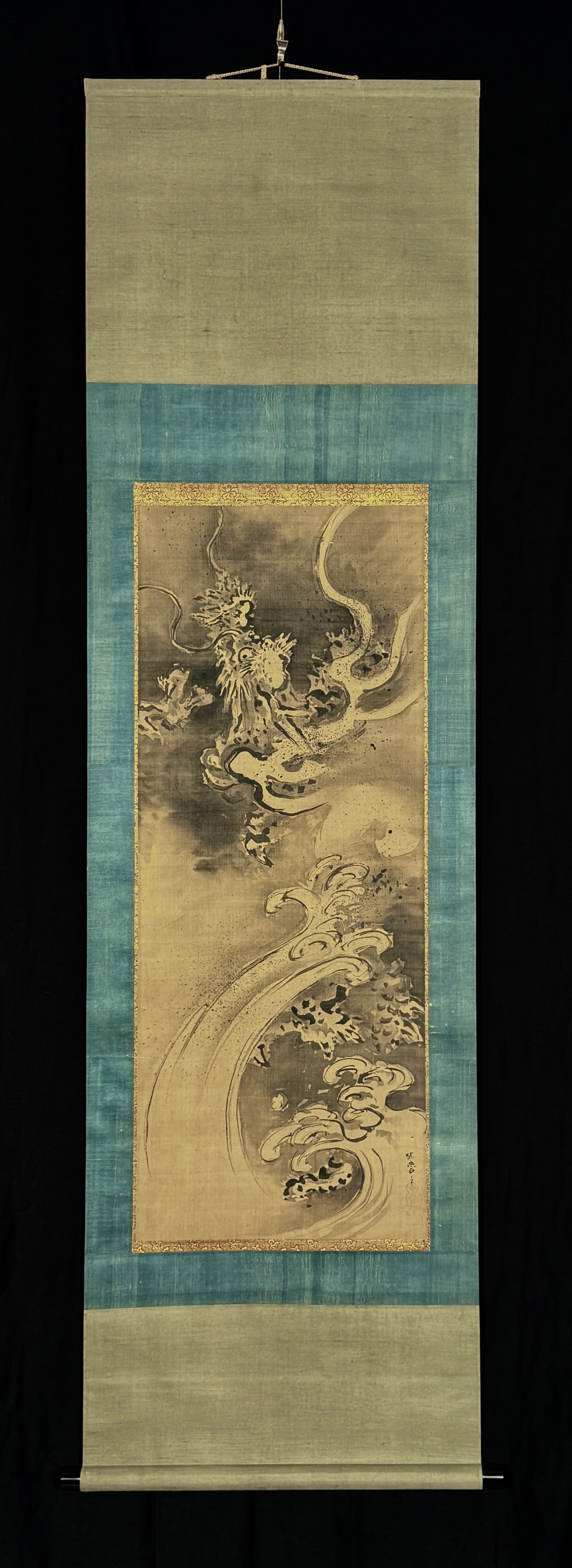 Wie sehr Drachen mit dem Wasser verbunden sind, zeigt sich eindrücklich auf diesem Bild. An der Basis sieht man aufschäumende Wellen, doch wenn man genauer hinschaut, erkennt man, dass die Formen sich kräuselnder Wellen sich kaum von Krallen und Schuppenpanzer dahinter unterscheiden. Glaubt man auf Anhieb, der Drache sei nur in der oberen Bildhälfte präsent, so entdeckt man bald, dass er, wie es sich für ihn schickt, aus den Wellen aufsteigt.Kanō Tanyū hat einen sehr ähnlichen Drachen als Deckengemälde im Tempel Daitokuji in Kyoto gemalt. Die Haltung des Kopfes und die Schnauzhaare sind fast identisch. Die Form der Wellen ihrerseits sind den Wellen des berühmten Kormoran–Stellschirms von Tanyū ebenfalls verblüffend ähnlich.