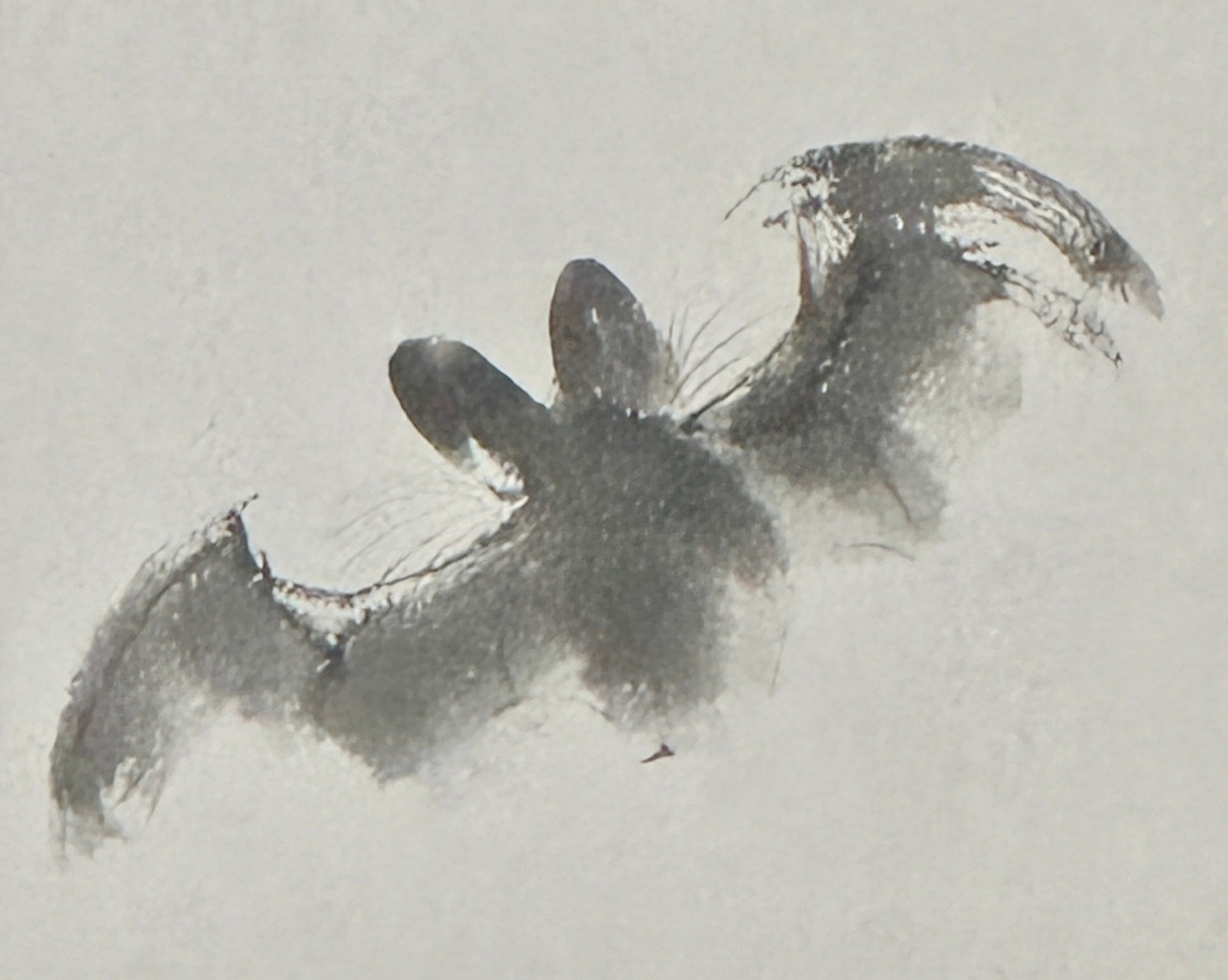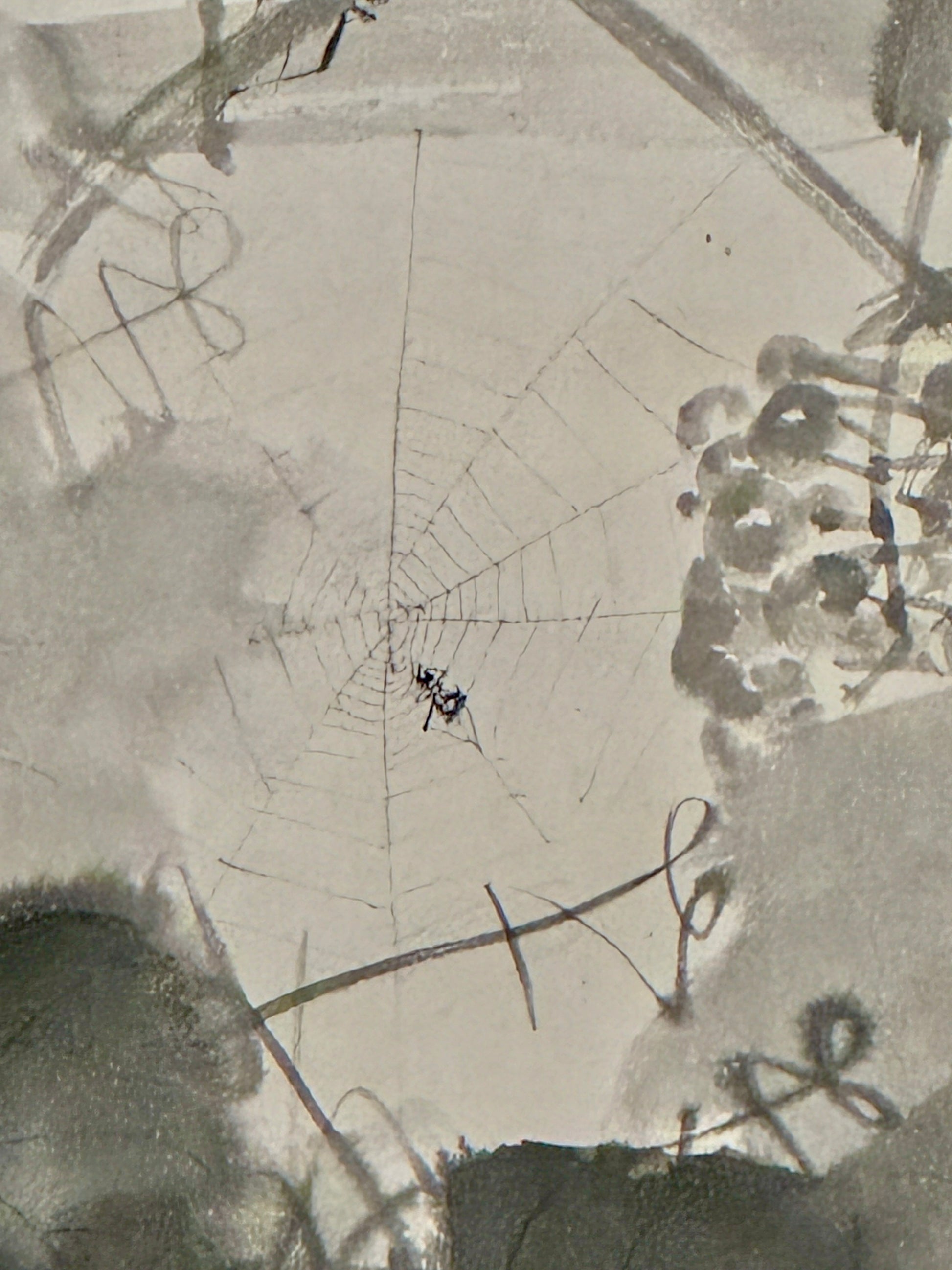 Buzan liebte kühne Kompositionen. Seine Liebe zur Pinselvirtuosität zeigt sich zunächst in der Fledermaus: Wilde wässrige Tuscheflecken werden durch feine Striche gebändigt und flößen dem Tier Beweglichkeit und Leben ein. Die ebenso dunklen, geradezu pathetisch gemalten Traubenblätter kontrastieren effektvoll mit dem feinen Spinnennetz, das im Laub aufgespannt wird.