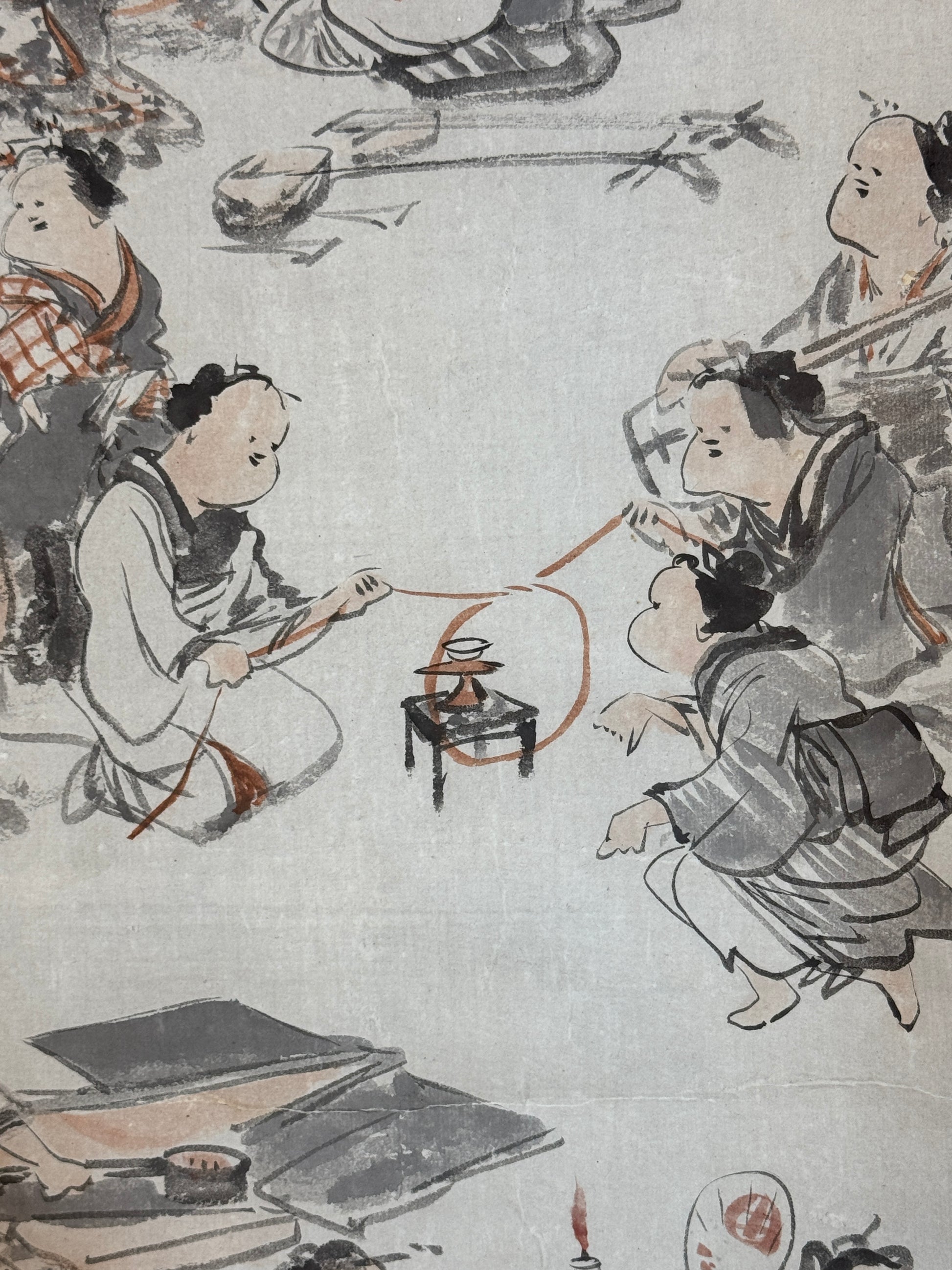 Hundertschaften von Glücksbringern kennt man auch in der Form von Kranichen oder Schildkröten; wenn es sich um otafuku handelt, bekommt man eine ganze Palette von vergnüglichen Distraktionen präsentiert. Schaut man sich das Bild an, kann man unzählige von herrlichen erzählerischen Details entdecken. Dennoch ist das Bild als Ganzes großzügig aufgebaut und überzeugt durch seine gebändigte Fülle und einen leichten, parlierenden Pinselstrich.