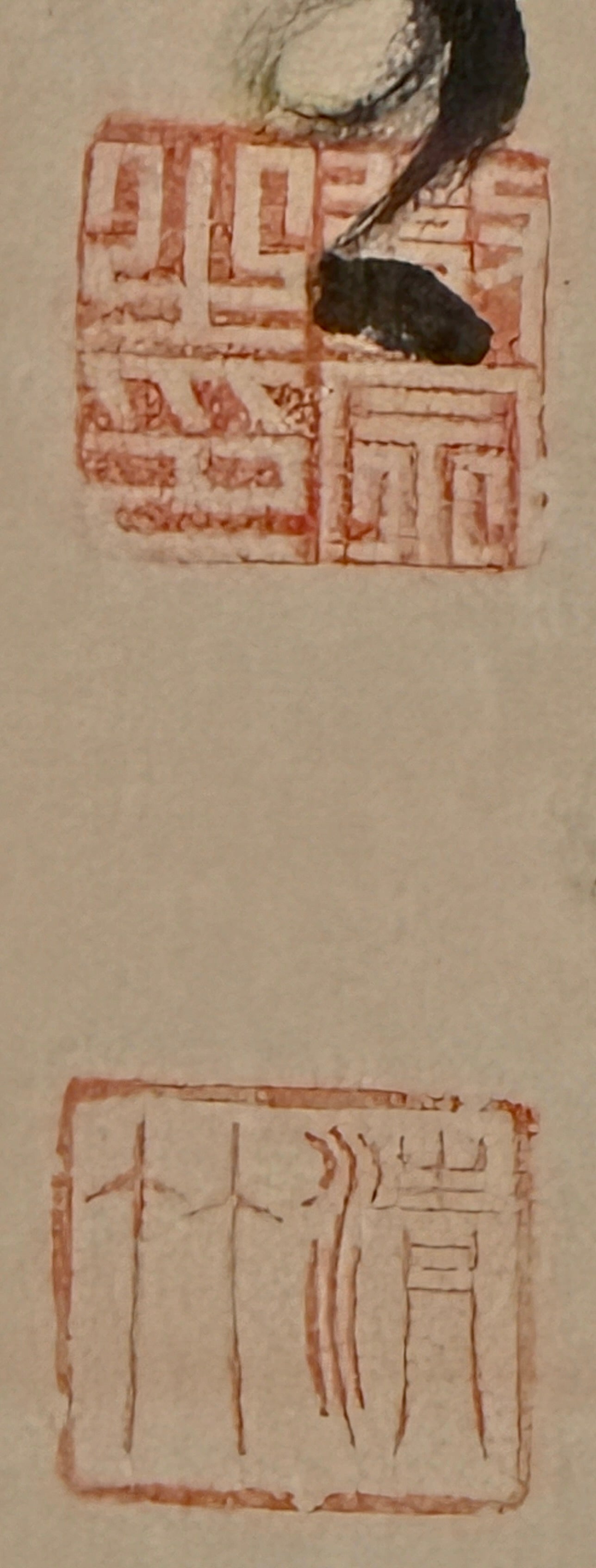 Der Rhythmus der Zeichen-Gestaltung ist eindrücklich: So ist doch am Anfang die Kiefer klar zu erkennen, sie steht unverrückbar da, während das dritte Zeichen, die Wolke, stark vereinfacht, geradezu „unförmig“ wirkt. Danach braucht der Kalligraf, für den Schluss der Zeile, eine Basis, mit der er gleichsam die Schriftsäule erden kann, und so wölbt er beim Zeichen für „Ruhe“ den Bogen mit der übrig gebliebenen Tusche besonders kräftig und nimmt sich Zeit für das letzte wohl formulierte Detail dieses Zeichens.