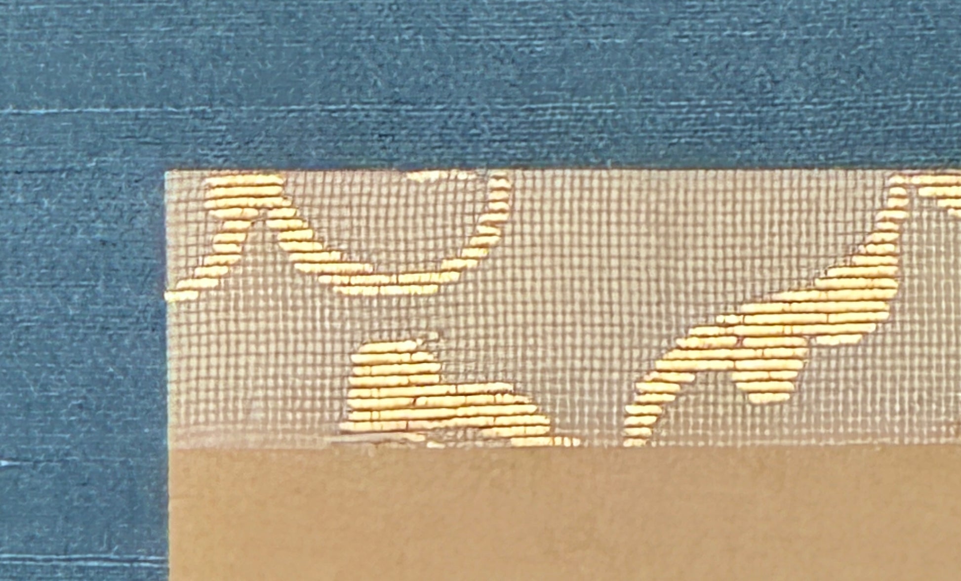 Das Bild ist neu montiert, eingefasst mit einer Seide in sattem Blau, und einem hellen, Regenfarbe assoziierenden Graublau oben und unten. Die beiden Zierbänder (fūtai), die ja oft plastisch appliziert werden, sind hier nur durch zwei Stoffstreifen angedeutet. Auch solches Understatement hat eine elegante Note