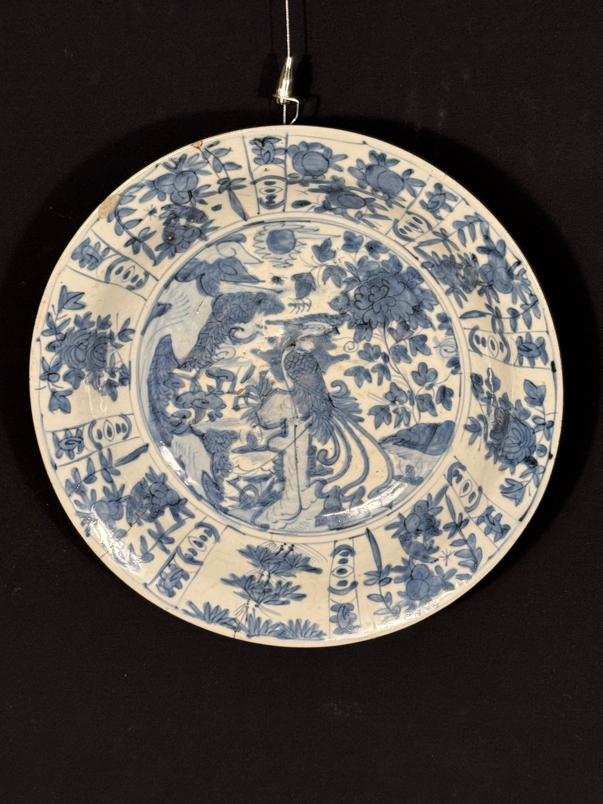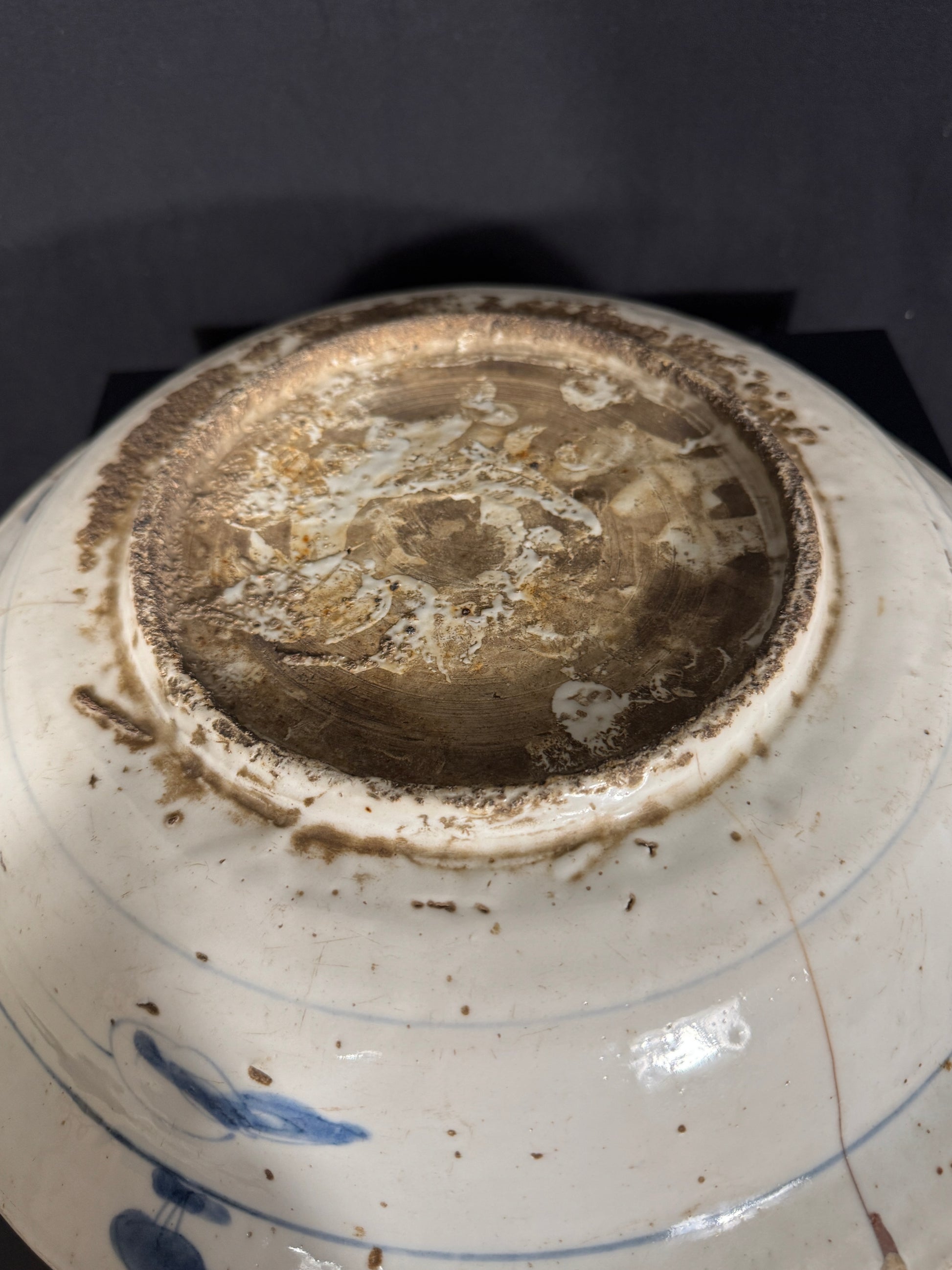 Die Schale weist feine kleine und einen größeren Sprung auf, eine alte minore Verletzung am Rand und auf der Rückseite Brandfehler, wie das für chinesische Schalen von diesem Alter nicht außergewöhnlich ist.