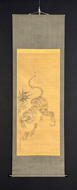 Nicht alle seine hinterlassenen Werke reichen also an die Kunst seiner beiden älteren Brüder heran (darin sind sich die Kunst-Fachleute einig), doch immer wieder finden sich Bilder, die dem Können von Tanyū und Naonobu ebenbürtig sind. Gilt das nicht auch für dieses Tigerbild? Die Maler des frühen 17.Jahrhunderts kannten Tiger nur aus Malerei-Vorbildern – erst im 19. Jahrhundert konnten Japaner erstmals in Edo (Tokyo) einen lebendigen Tiger sehen. Solchen frühen Tigern haftet also immer etwas Unwirkliches an, d.h. Tiger waren mehr Symbole als zoologische Realitäten. Dieses Bild könnte deshalb auch Teil eines Diptychons sein, auf dessen rechtem Bild ein Drache dargestellt ist; das Bildpaar hätte dann das Thema: „Herrscher der Erde“ versus „Herrscher der Lüfte“.