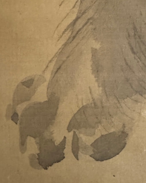 Was dieses Tigerbild bewundernswert macht, ist zunächst der Umgang mit der Tusche, die - mit Ausnahme von wenigen Bambusblättern und ein paar Fellstreifen - recht wässerig ist. Schaut man sich etwa die Pfoten an, so fällt auf, dass die Beweglichkeit des Pinsels und das Tempo des Strichs stimmig der Leichtigkeit der hellen Tusche entsprechen. Hinzu kommt, dass die katzentypische Beweglichkeit des „Herrschers der Erde“ von einer S-Form durchdrungen ist. Sie ist nicht nur klar in der Schwanzschleife erkennbar, man spürt sie auch in der Gestaltung des Hinterteils in Beziehung zum linken Hinterbein und ebenso in der Beziehung von Rumpf zu abgewinkeltem Kopf. Ein strenges (und sinnvolles) Form-Prinzip also scheint diesen Körper so zu durchdringen, wie wir das in Tigerdarstellungen jener Zeit kaum je finden.