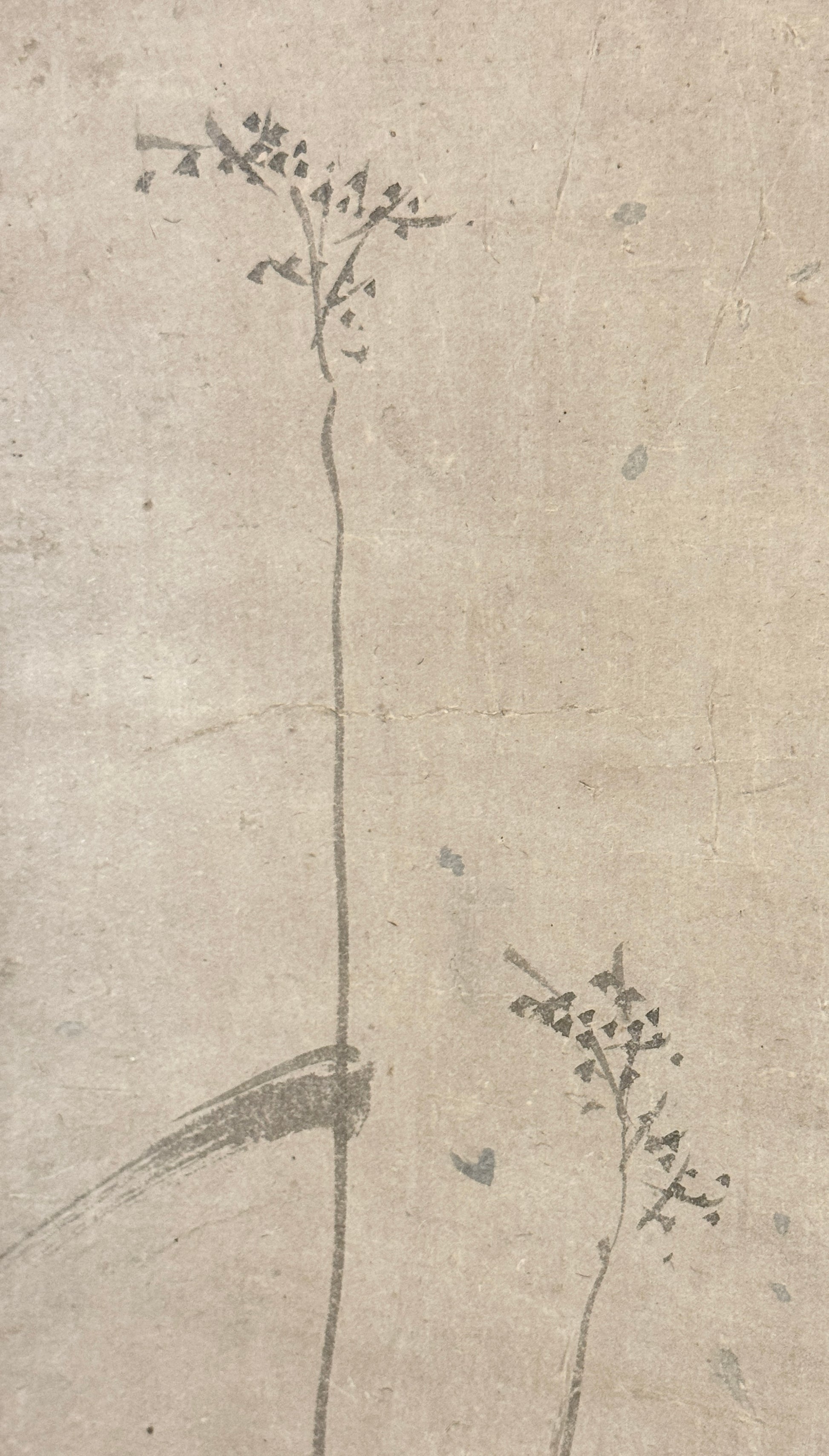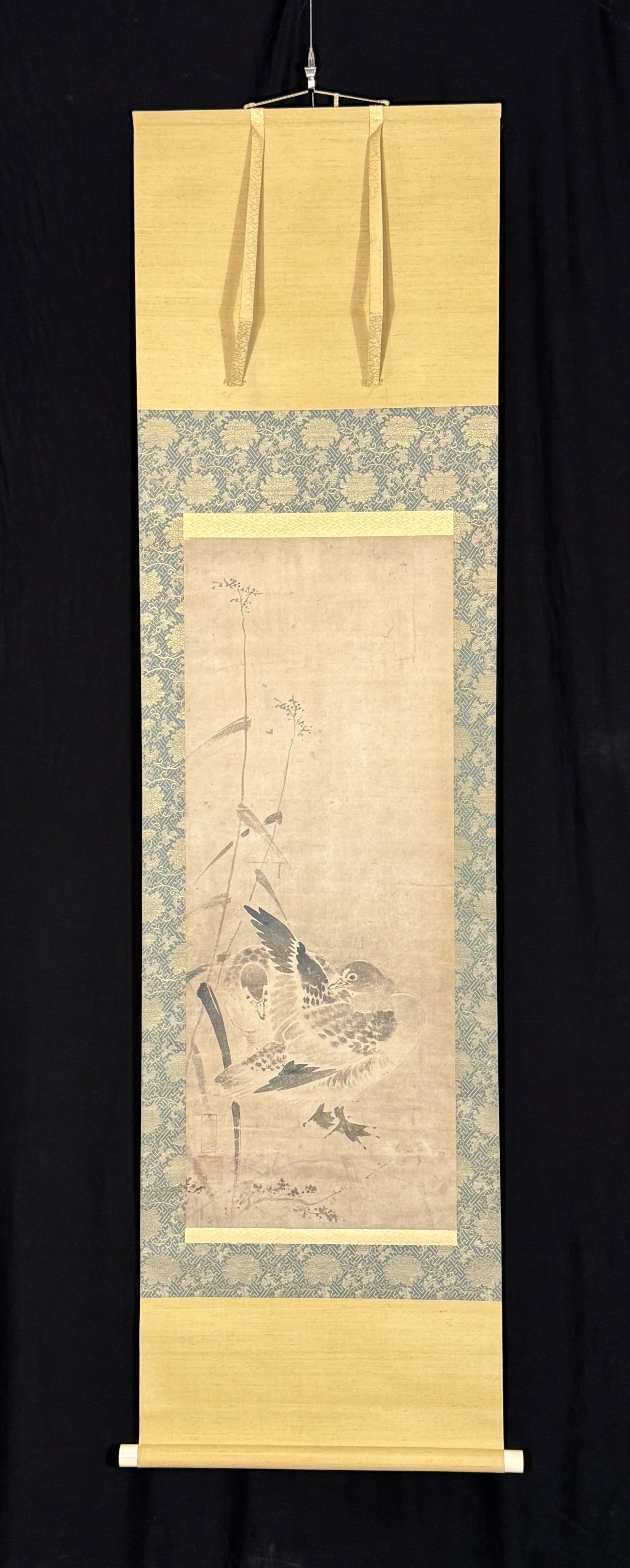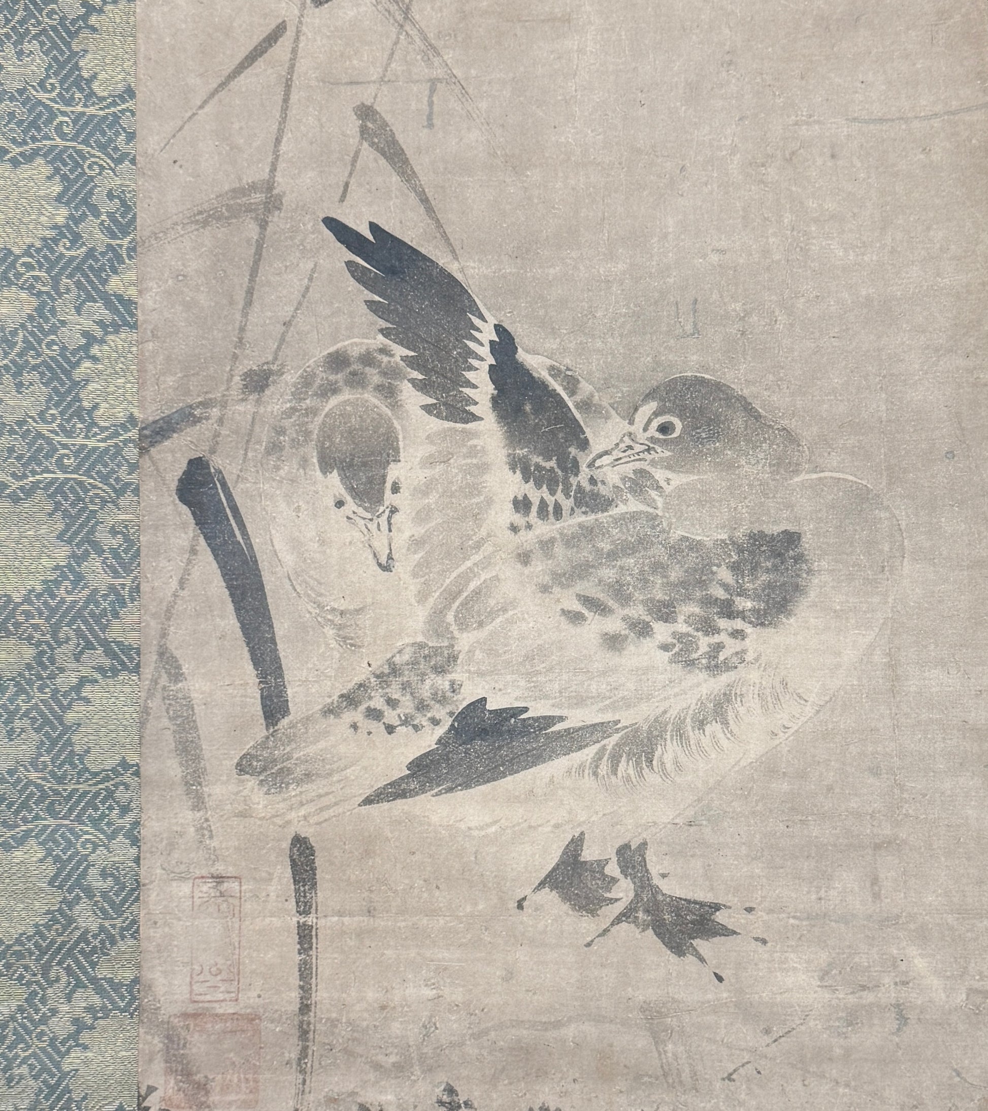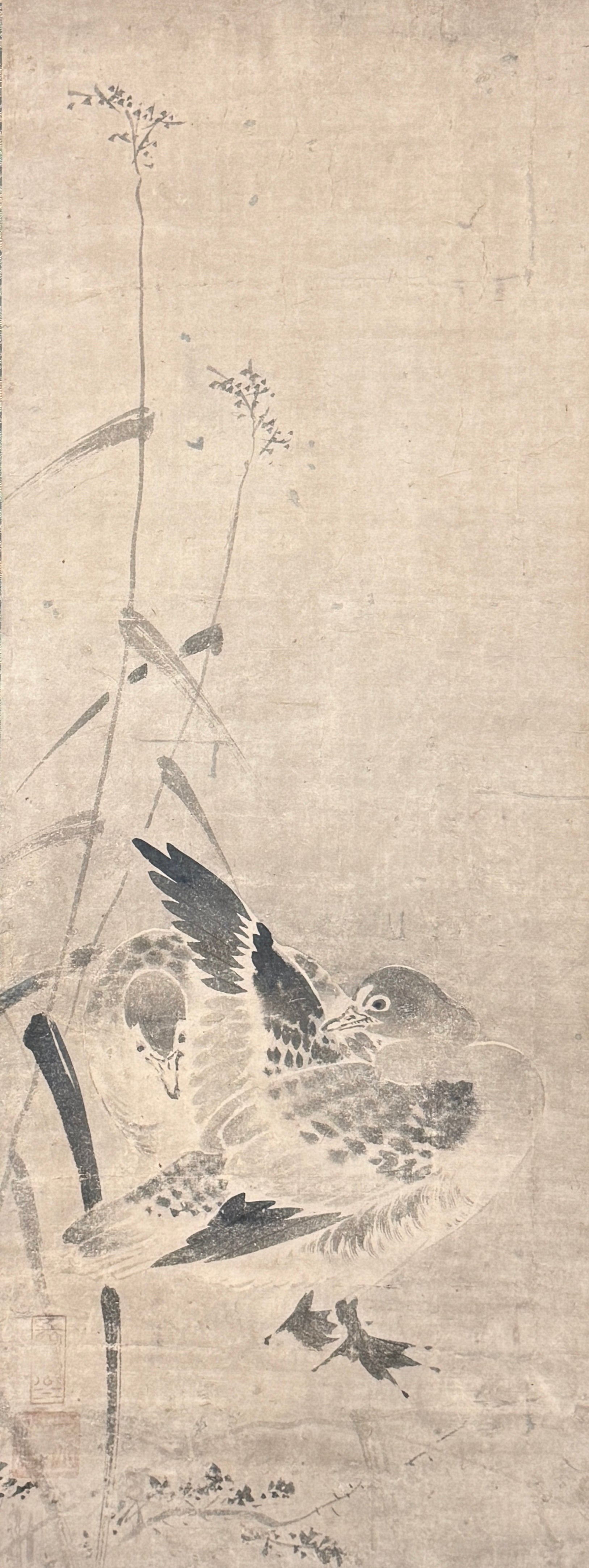 Dieses Bild ist mit zwei Stempeln signiert, die nicht mit Sicherheit gelesen werden können. Vom Stil und von der Graufärbung des Papiers her muss die Tuschemalerei um 1600 entstanden sein. Sie ist in gutem Zustand, und das Bild ist perfekt neu montiert.