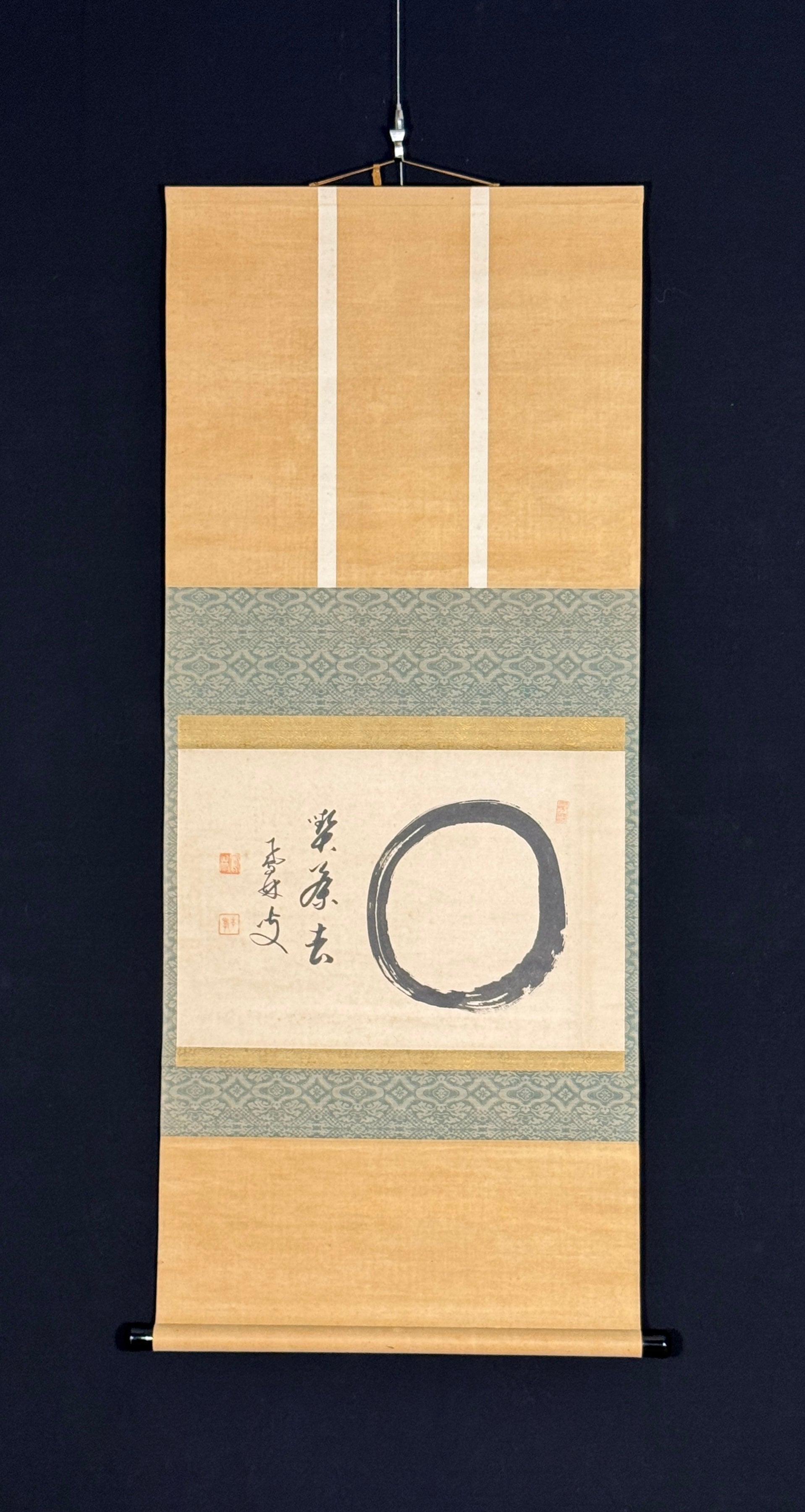 Kreise zu malen ist eine wichtige Konzentrations- und Meditations-Übung für Zen-Mönche. Das Faszinierende an dieser Disziplin ist die Reduktion der Aussage auf eine vorgegebene Form. Doch gerade die Beschränkung der Mittel verlangt vom ernsthaften Kreis-Maler höchste Aufmerksamkeit für jeden Aspekt und jedes Detail. Vorgegeben ist das Format des Blatts, das natürlich die Dimensionen des Kreises bestimmt. Bei diesem Kreis nützt der Priestermaler das Blatt derart, dass auf drei Seiten ungefähr gleich viel Abstand zum Blattrand entsteht. Das bewirkt Halt und Verankerung der Form. Um mit dem relativ großen Durchmesser des Kreises das Format nicht mit zu viel Energie zu belasten, wählte der Maler bedacht einen relativ dünnen Strich, womit die „Leere“, die der Kreis umschreibt, besonders stark fühlbar wird.