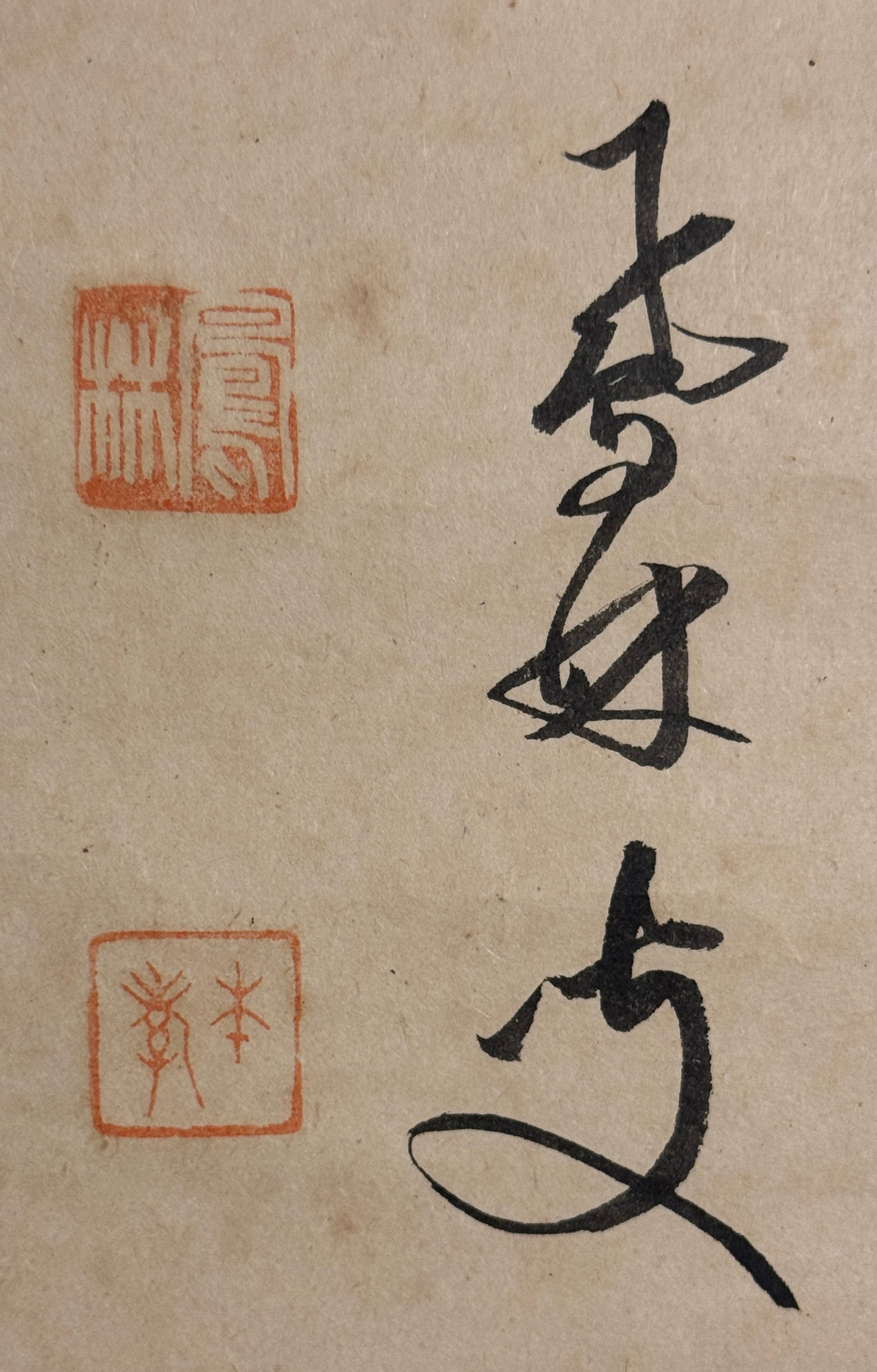 Der eher dünne Strich erlaubte dem Ausführenden auch, den Pinsel ausgesprochen sensibel zu führen: Er setzt (um die Uhrziffern als Verständigungsmittel der Positionen innerhalb des Kreises zu benutzen) bei 6 mit wenig Kraft und nur mäßig Tusche an. Das Hochziehen des Pinsels über 7 bis 11 (was keiner kanonisierten Kalligrafie-Bewegung entspricht) franst ein wenig. Das heißt, der Maler hat einen leichten Arm – er wägt ab und bereitet sich auf die Intensität der Abwärtsbewegung ab 12 vor (die eine normale Pinselführung in der Kalligrafie ist). Bei 1 und 2 beginnt nun eindeutig innere Bewegung das kühle Betrachten zu verdrängen – der Strich fällt plötzlich fast senkrecht ab, und so spürt man ab 4 eine zunehmende Spannung im dicker werdenden Strich. Die Tusche im Pinsel wird voll aufgebraucht, und bei 5 zittert der Pinsel sogar erregt, bis er dann bei 6, wo er den bedächtigen und leichten Anfang der Tuschespur berührt, das Blatt kraftvoll verlässt. Die drei Zeichen links sind 喫茶去; sie bedeuten „Lass uns einen Tee trinken“ (ein traditioneller Zen-Spruch)